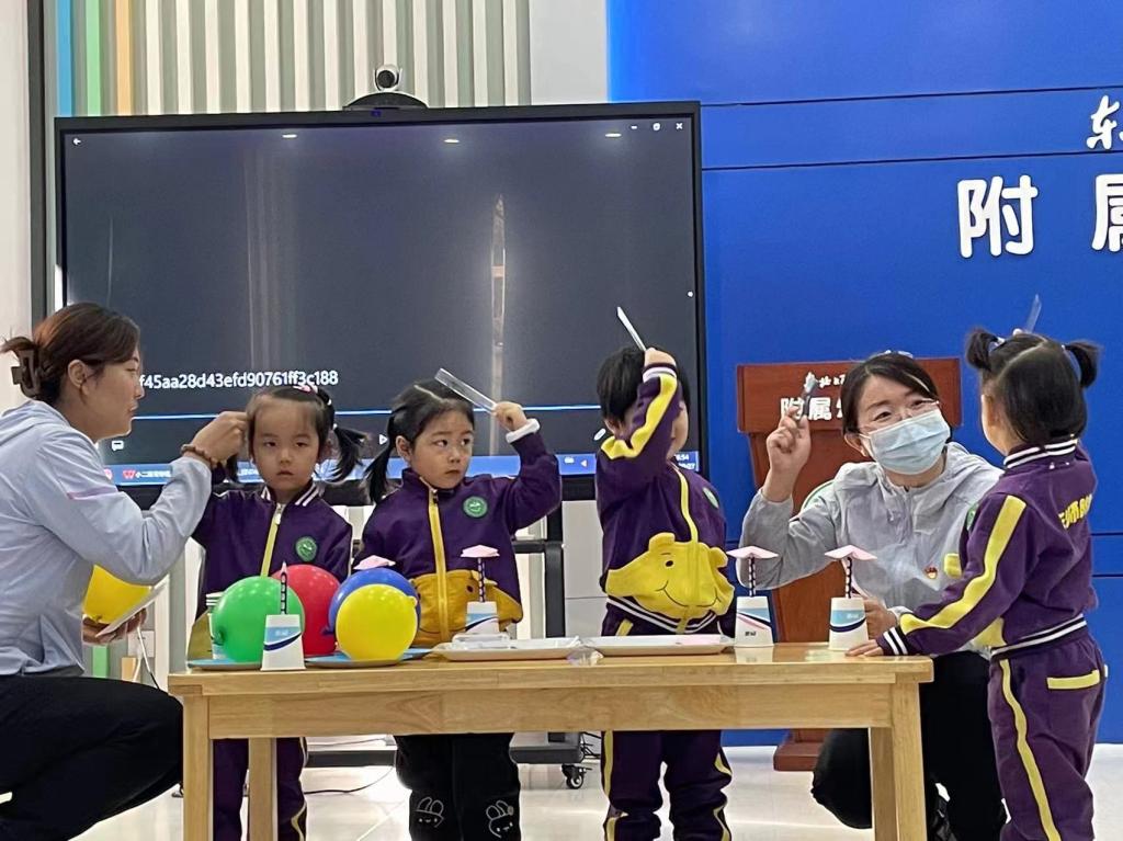 苗苗五班的小朋友们带来了《会飞的气球》和《神奇的泡泡》两个实验,了解了气球充气后,内部气体压强要大于大气压强,气球要恢复原来的形状,要不断变小,就会释放出气球中的气体,产生各种神奇的现象。小朋友们跃跃欲试,教室里充满了欢声笑语和创意的灵感。