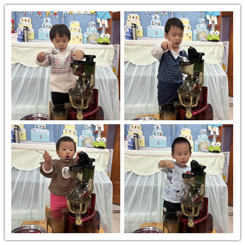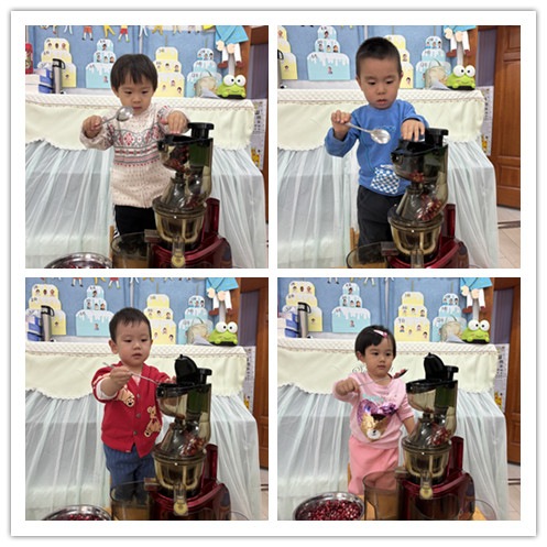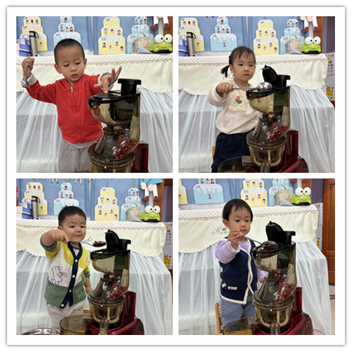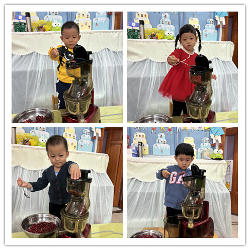 小朋友们已经认识了石榴,也进行了剥石榴比赛和品尝石榴,小朋友们开始好奇石榴榨汁好喝吗?于是今天,我们决定开始制作石榴汁。