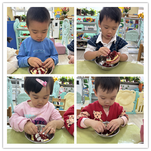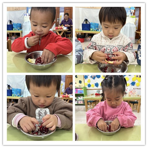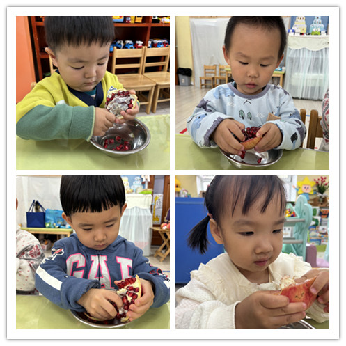 我们用小手将石榴去皮,剥到干净的容器里。