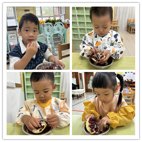 石榴是秋天的果实,榨石榴汁的过程中小朋友们了解到身边秋天的果实。也发现了石榴的变化。孩子们在在探索中发现了石榴的不同吃法。