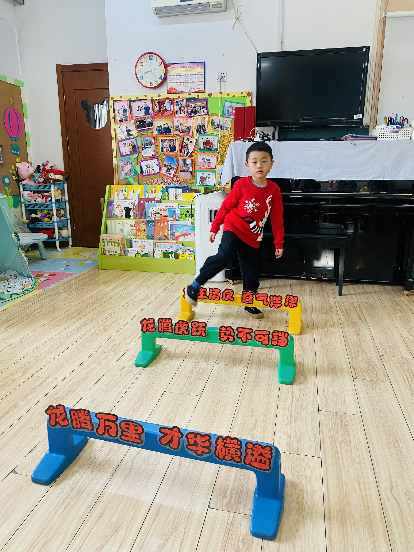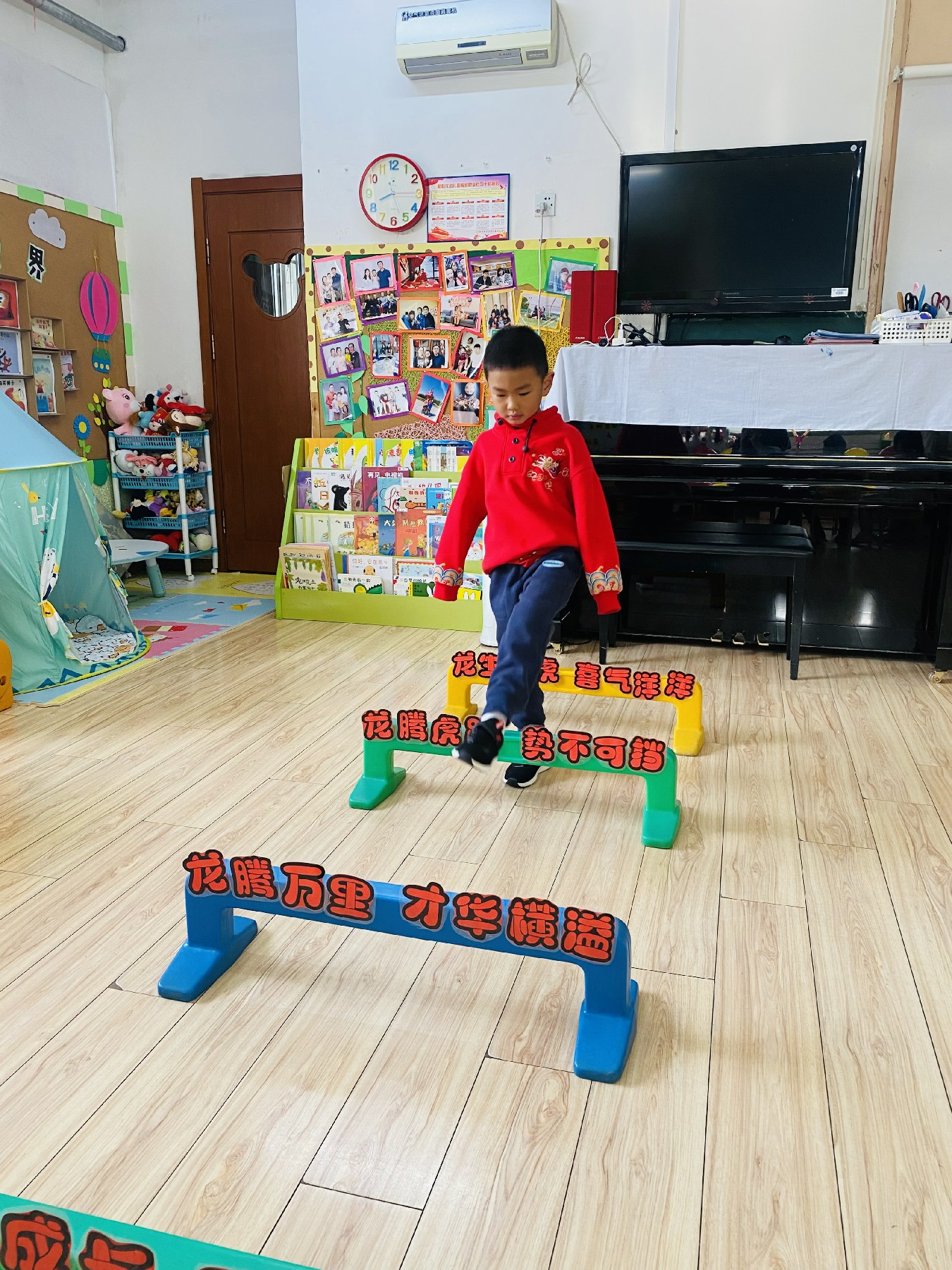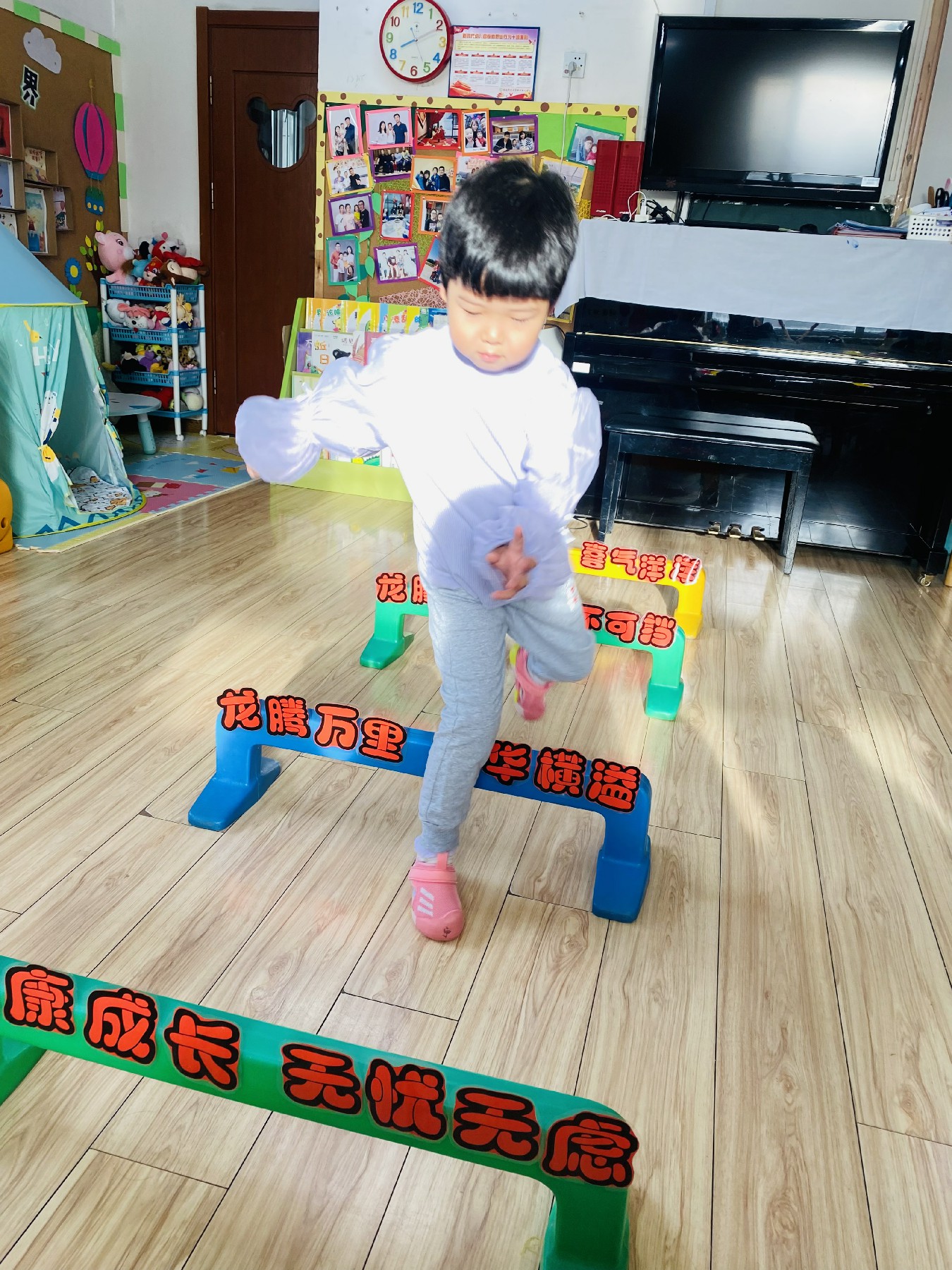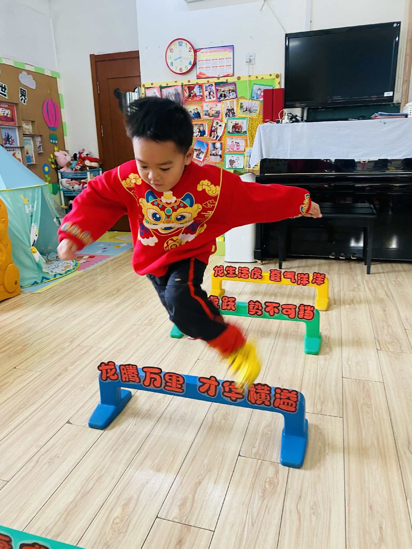 小朋友们高高兴兴跨过带有新年祝福的跨栏: