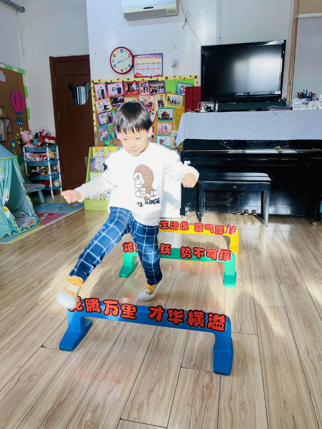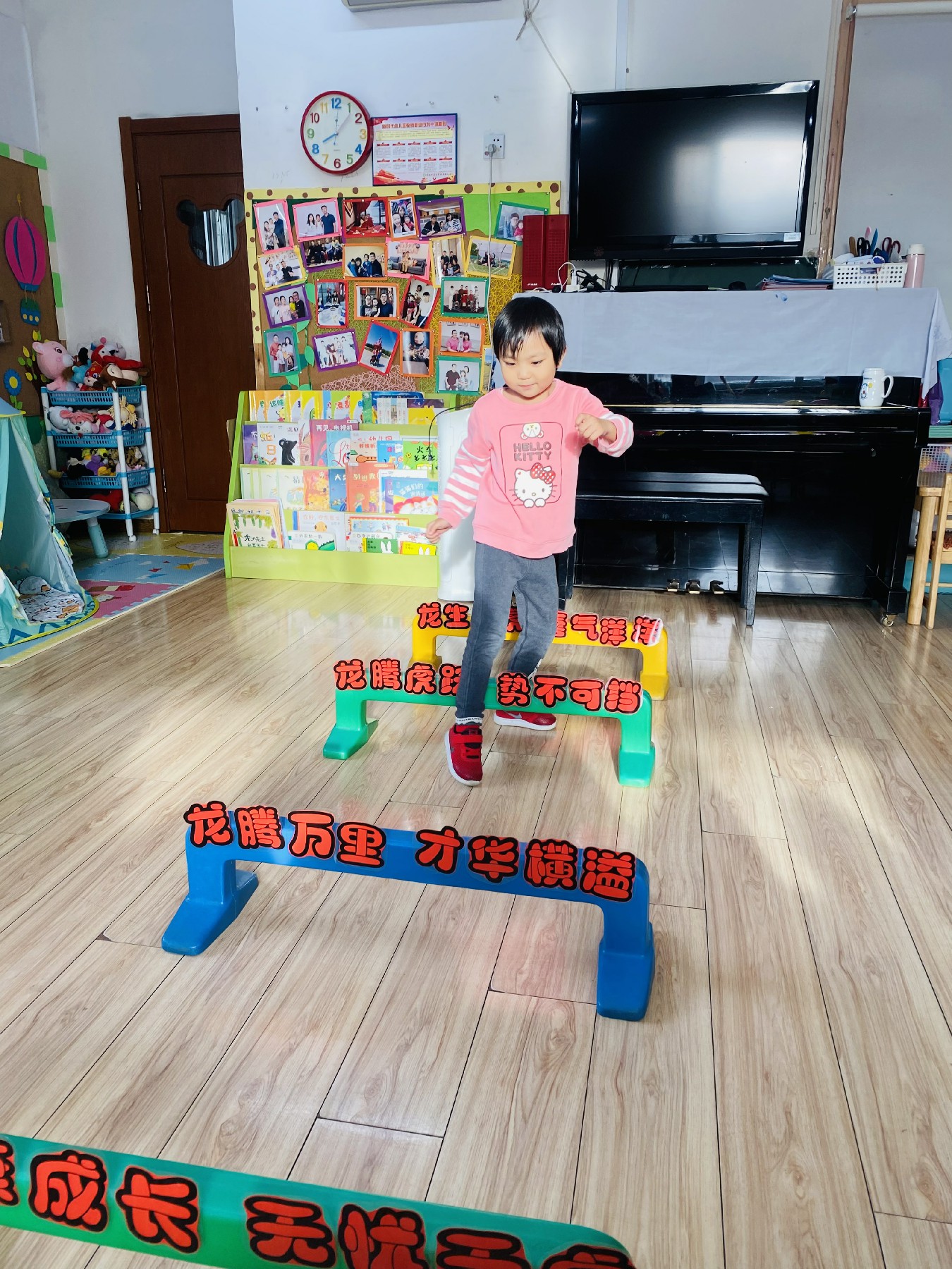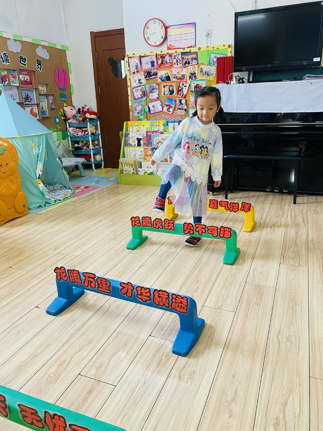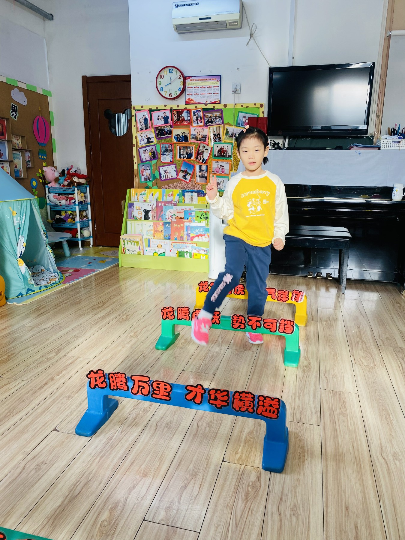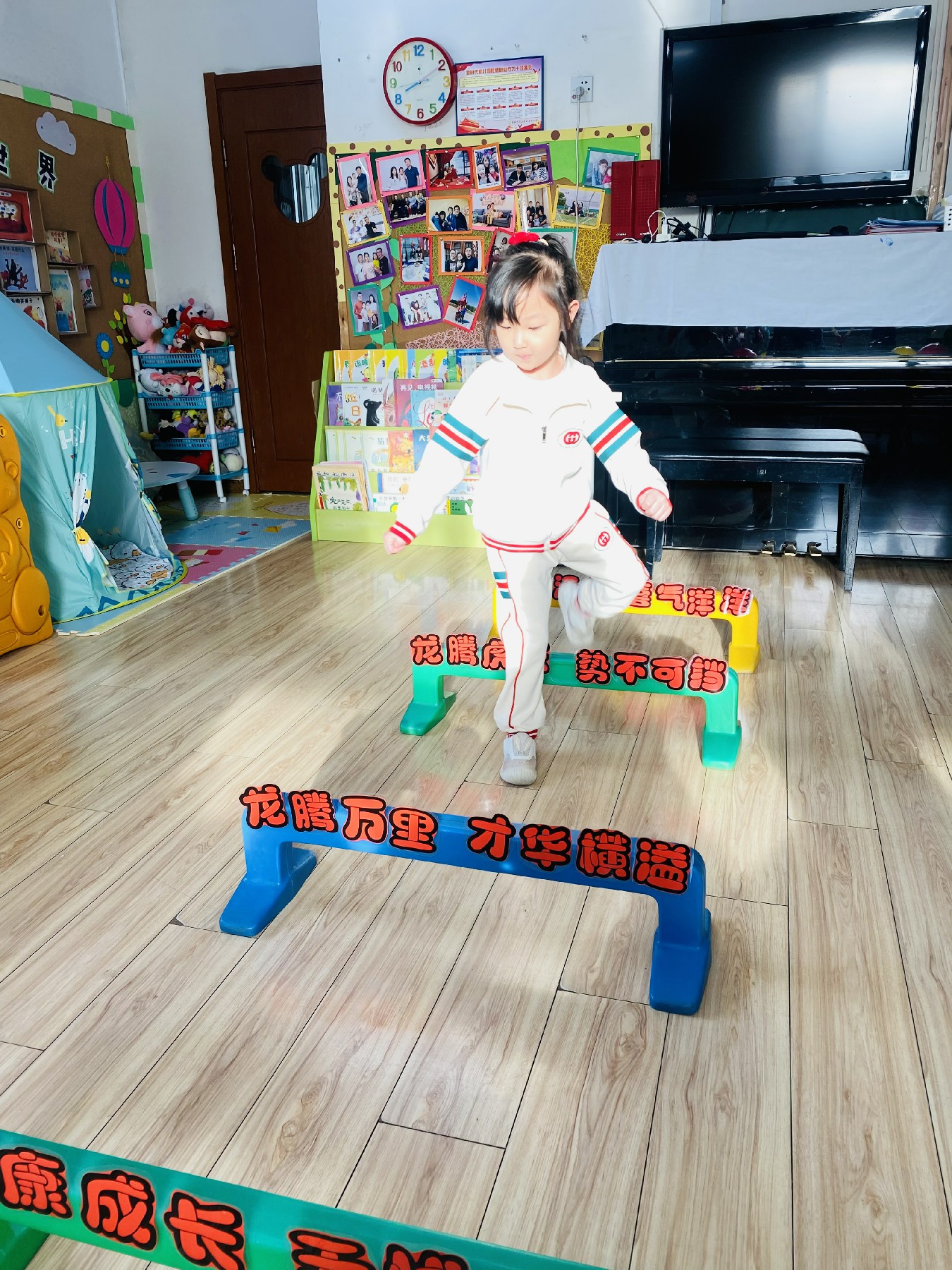 小朋友们高高兴兴跨过带有新年祝福的跨栏: