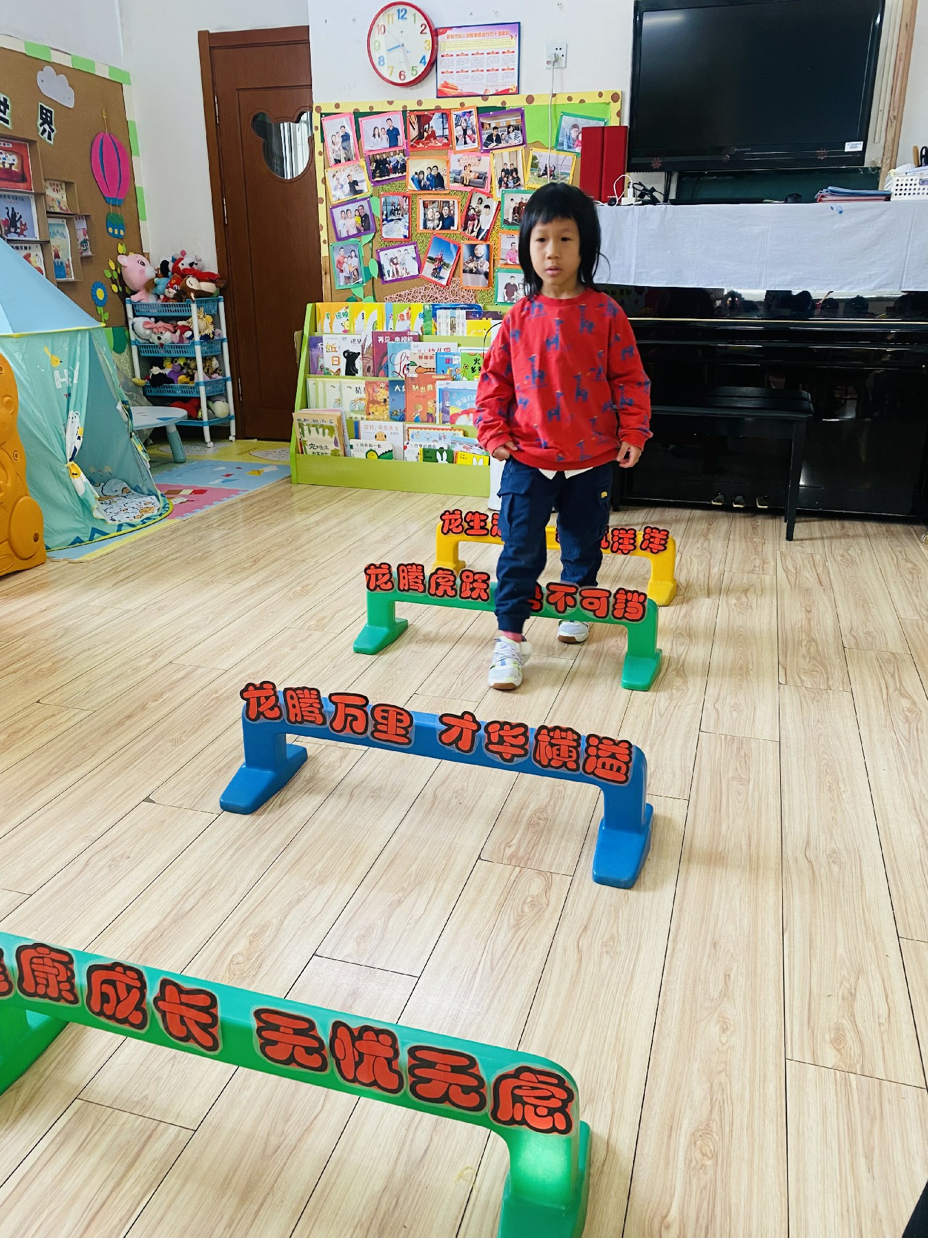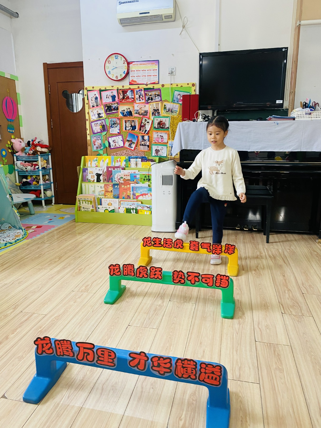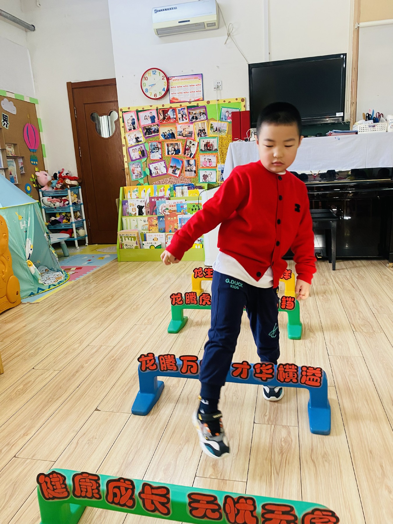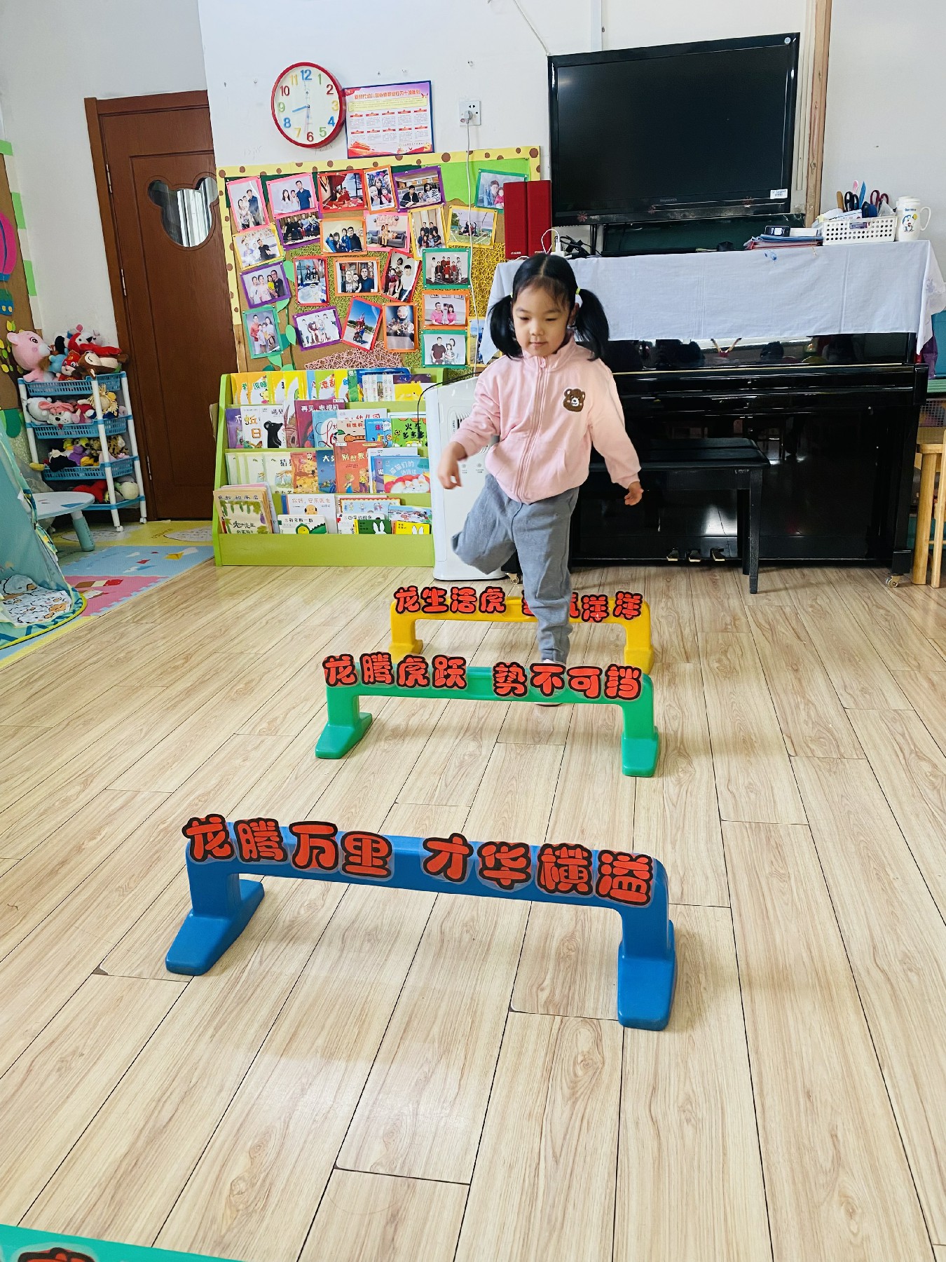 小朋友们高高兴兴跨过带有新年祝福的跨栏: