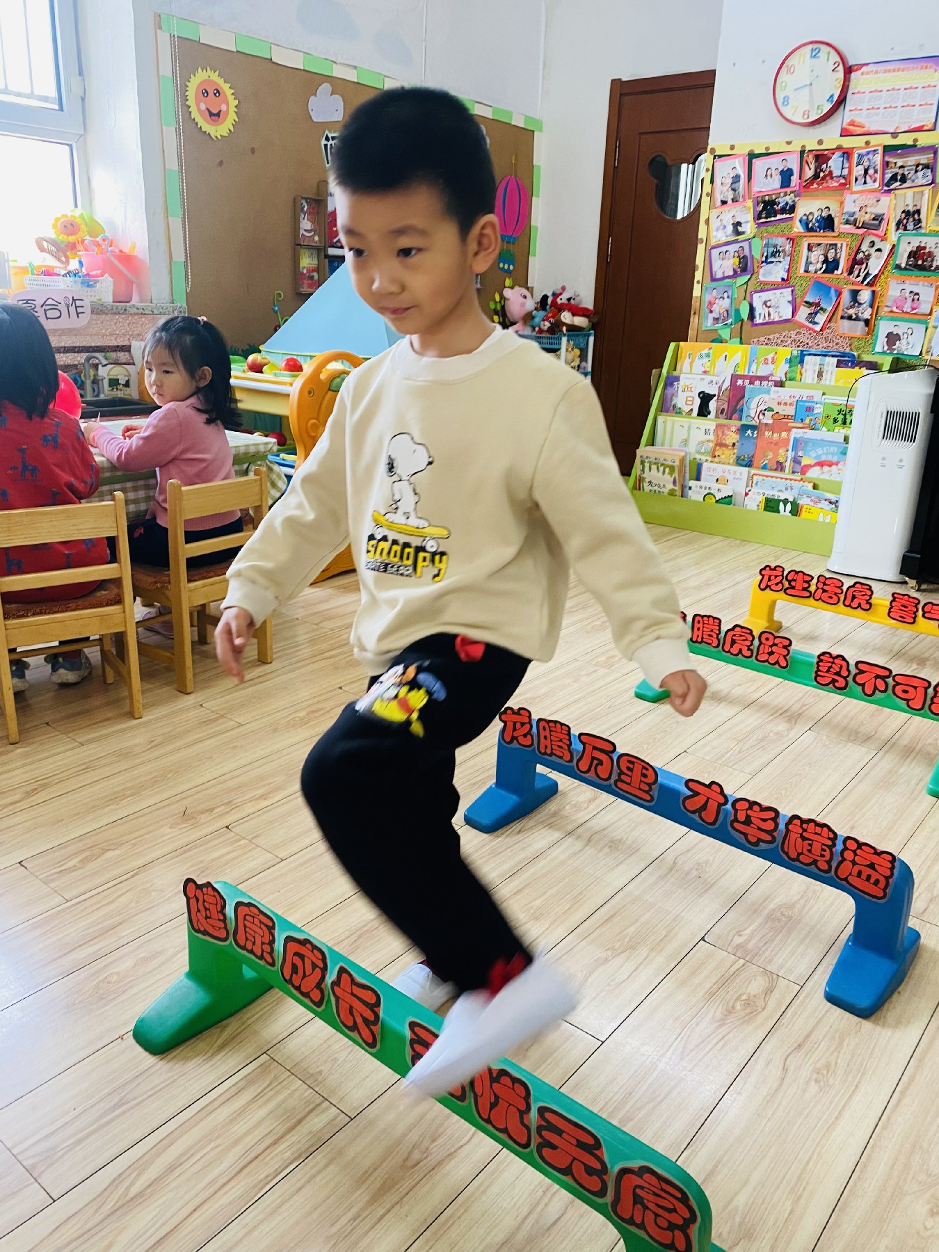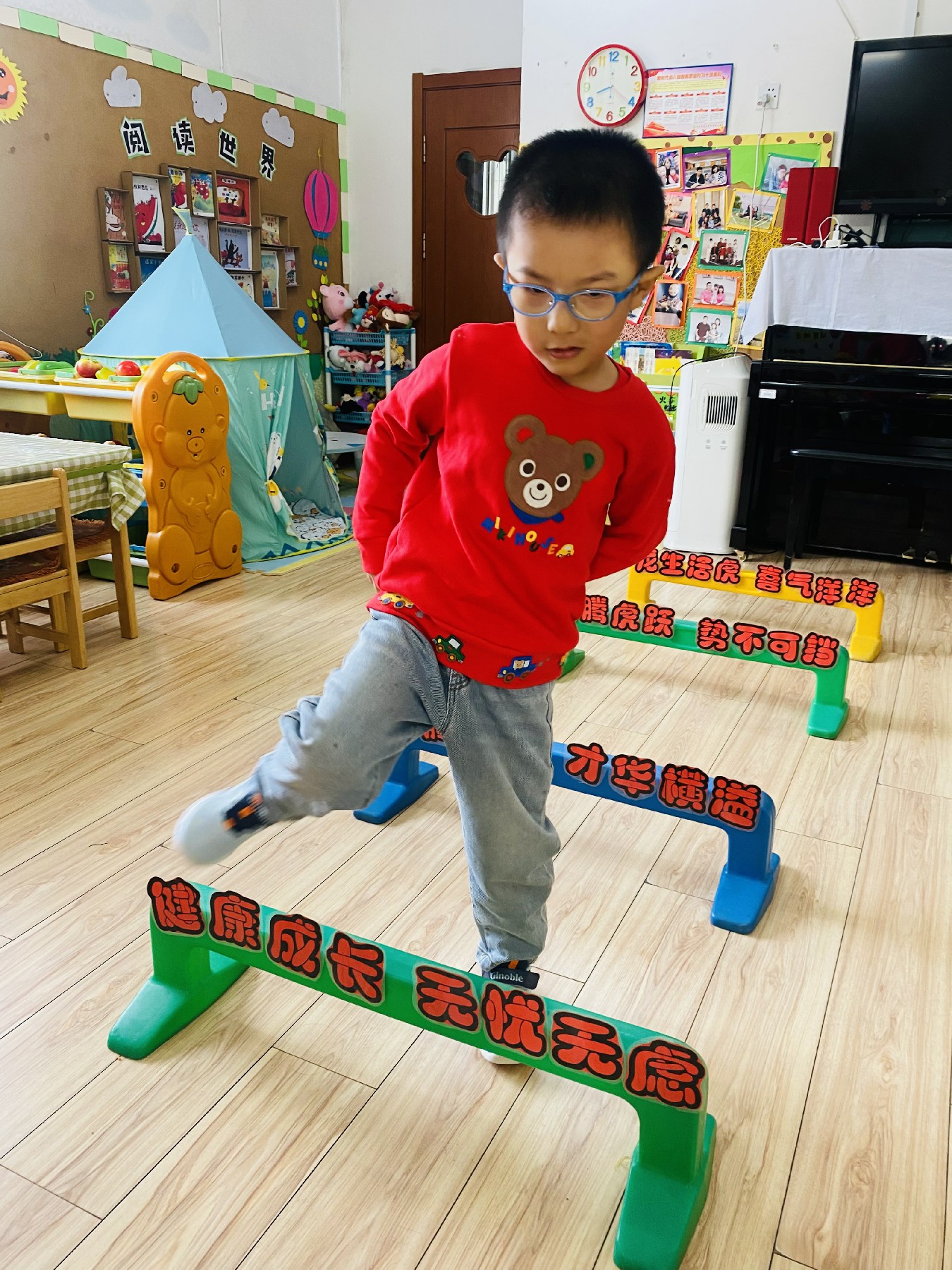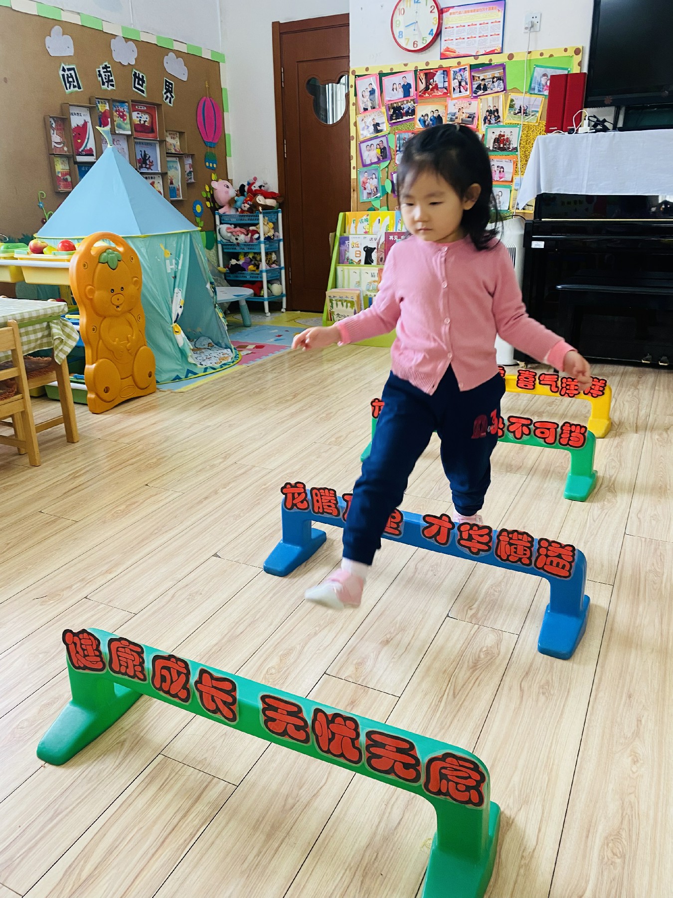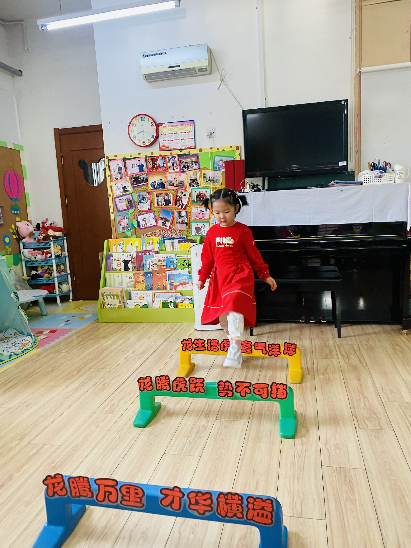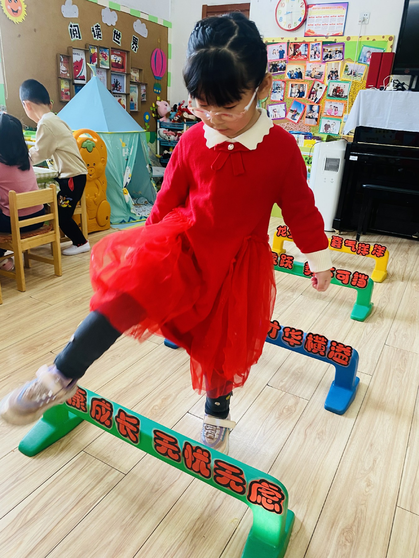小朋友们高高兴兴跨过带有新年祝福的跨栏: