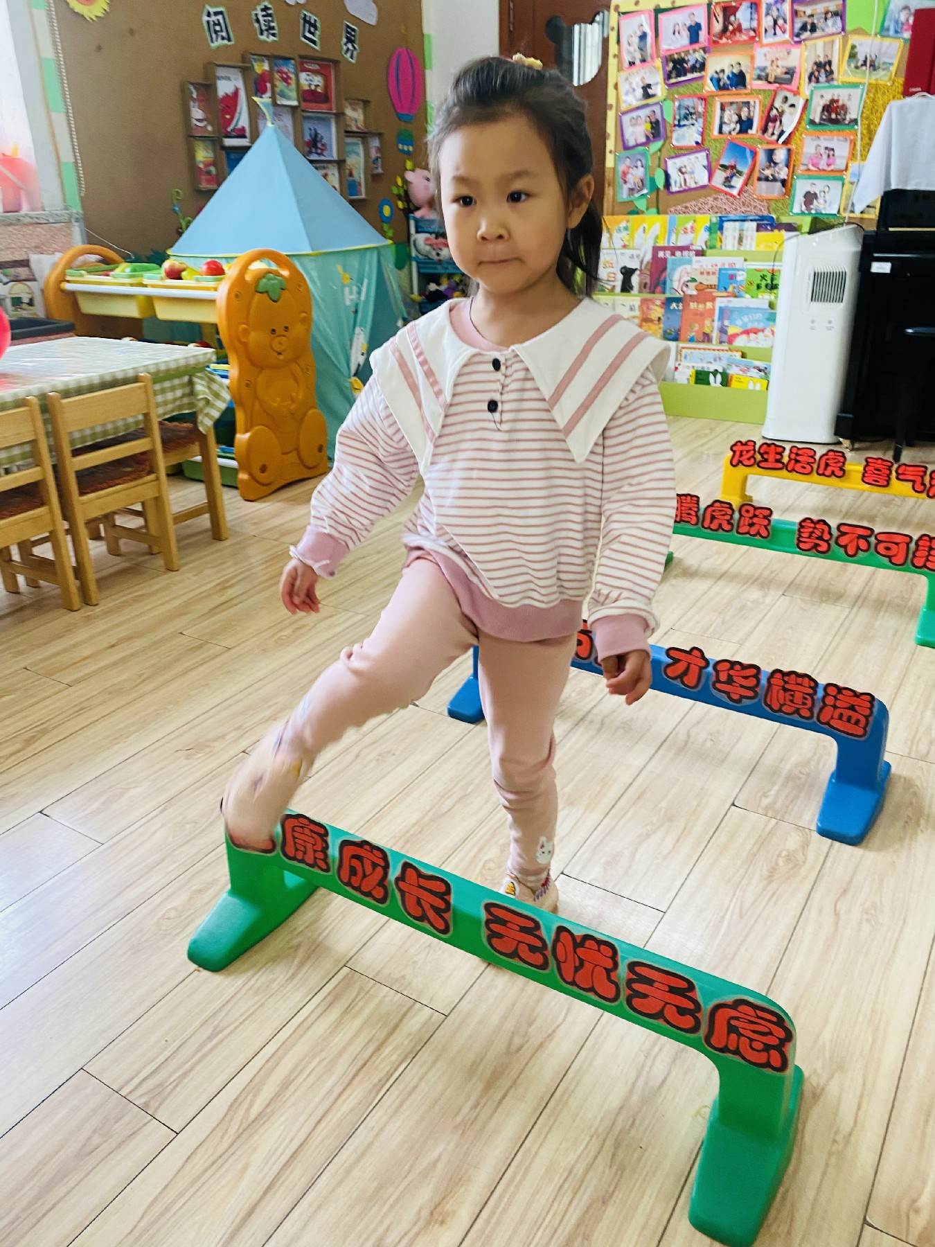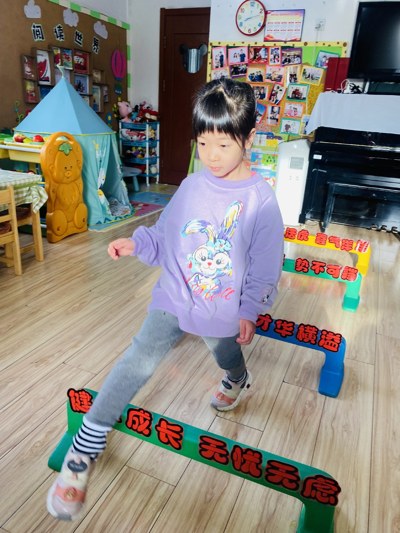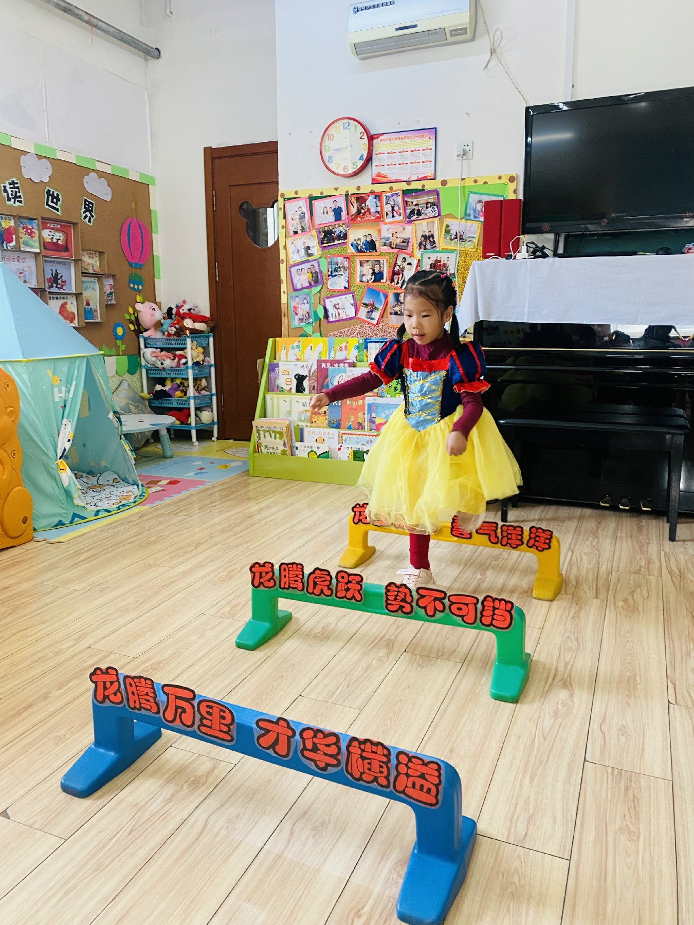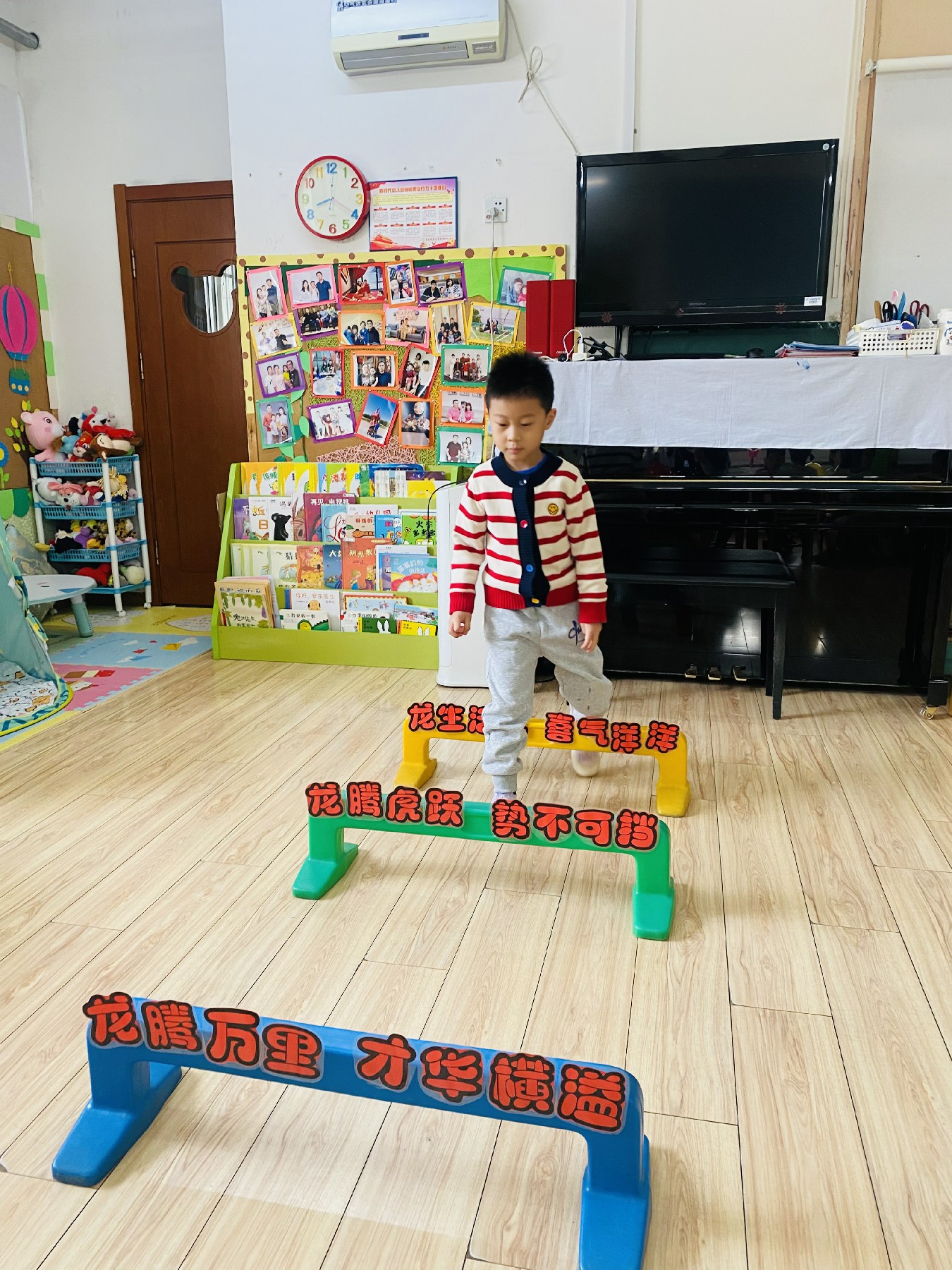 小朋友们高高兴兴跨过带有新年祝福的跨栏:
