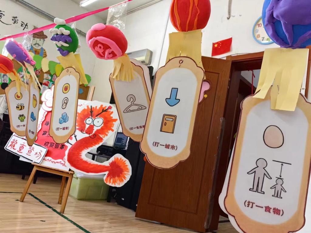 当灯笼制作完成后,宝贝们迫不及待地开始在上面悬挂灯谜。这些灯谜有的简单易懂,有的则充满了趣味性和挑战性。他们一边欣赏着五彩斑斓的灯笼,一边思索着灯谜的答案。他们或三五成群地聚在一起讨论,或独自默默琢磨,每个人都沉浸在这份独特的乐趣之中。