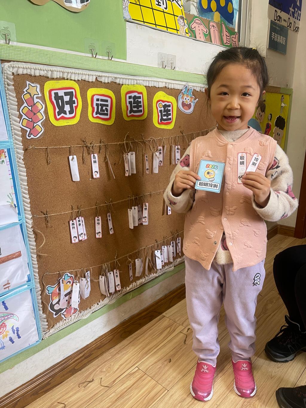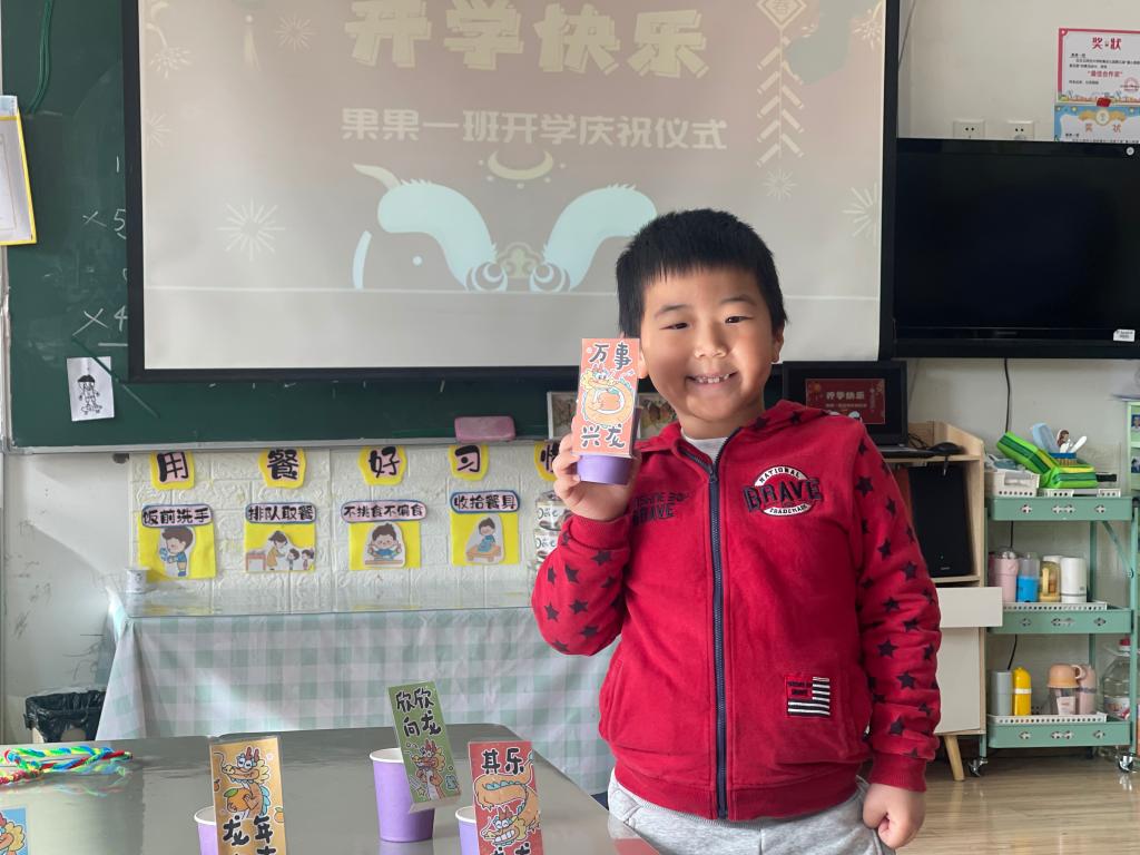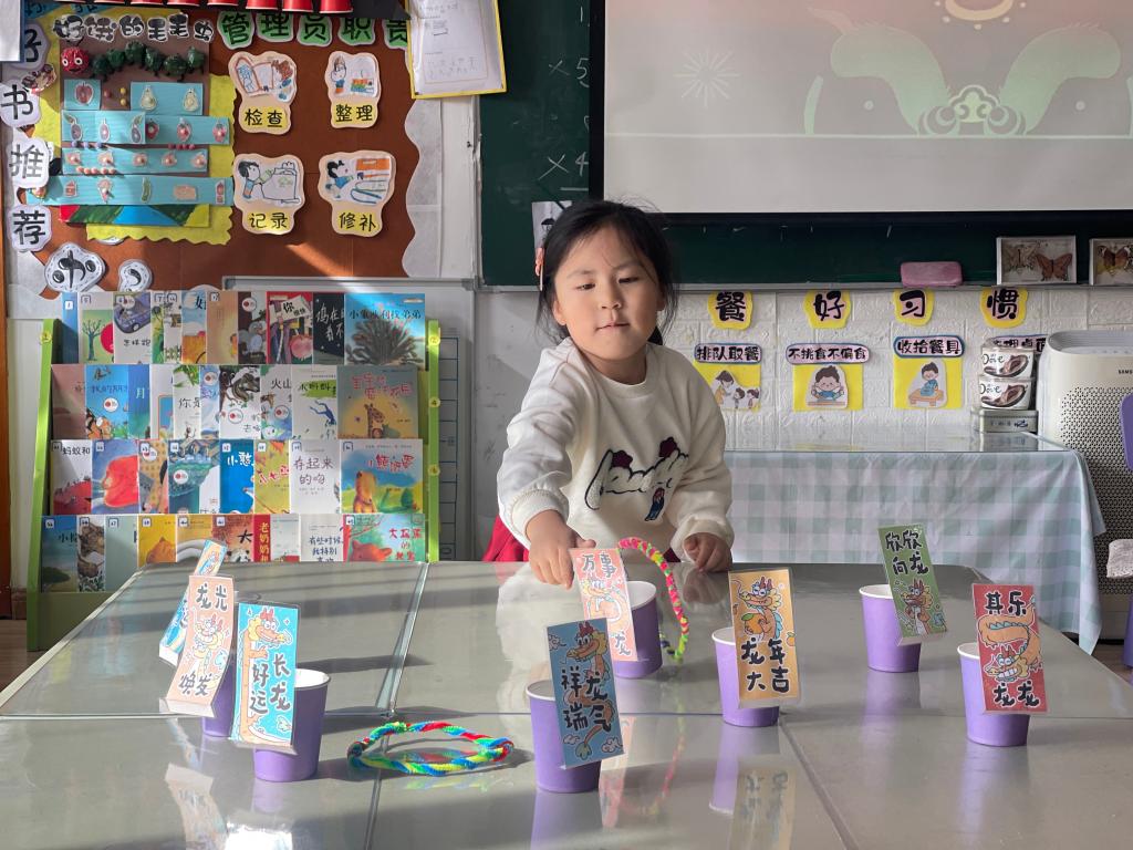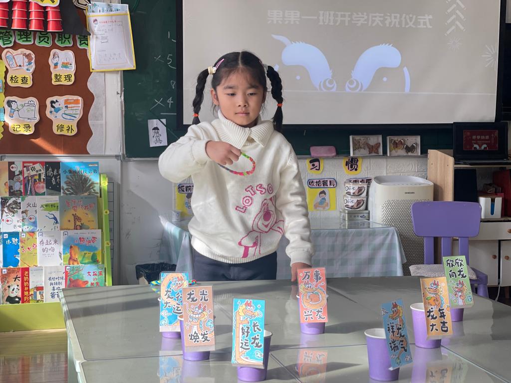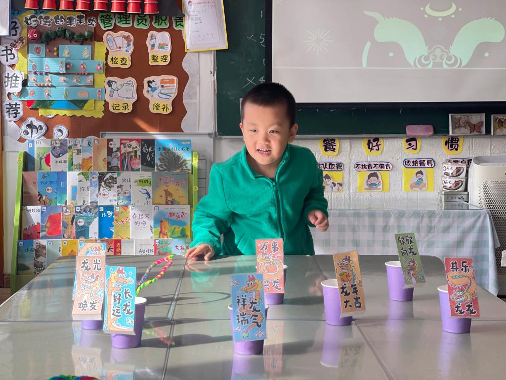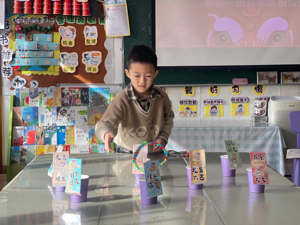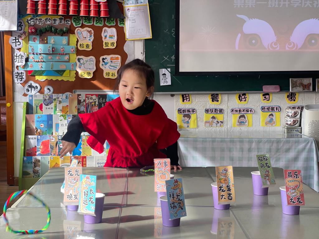 龙年大吉、祥龙瑞气、龙行大运、“龙”重登场、好运长“龙”、其乐“龙龙”、“龙”华富贵、“龙”光焕发、万事兴“龙”、欣欣向“龙”,这些谐音吉祥话可是让果果一班的小朋友们说得太溜了,跟我们的套圈游戏结合起来,一起套一句祝福话吧!