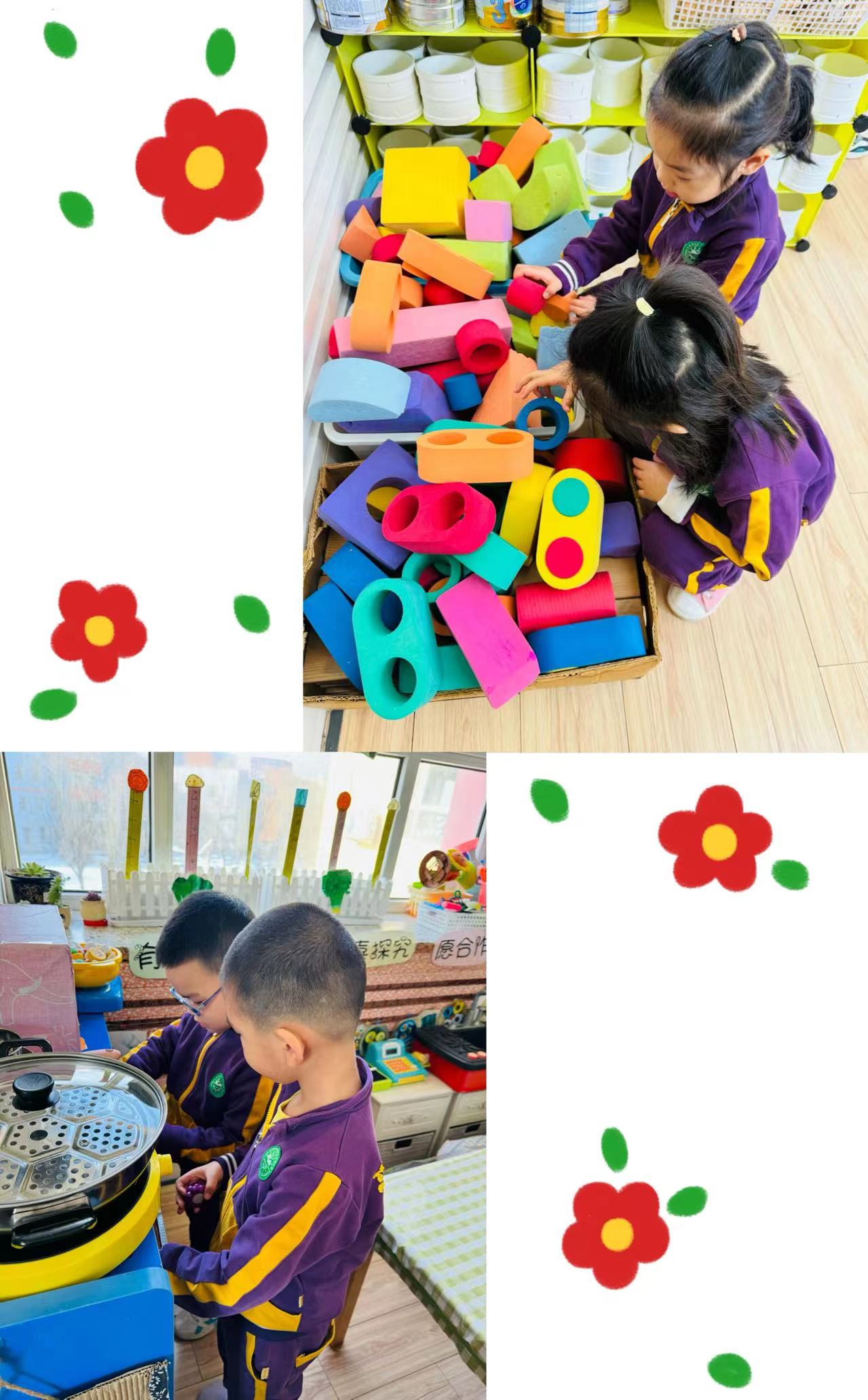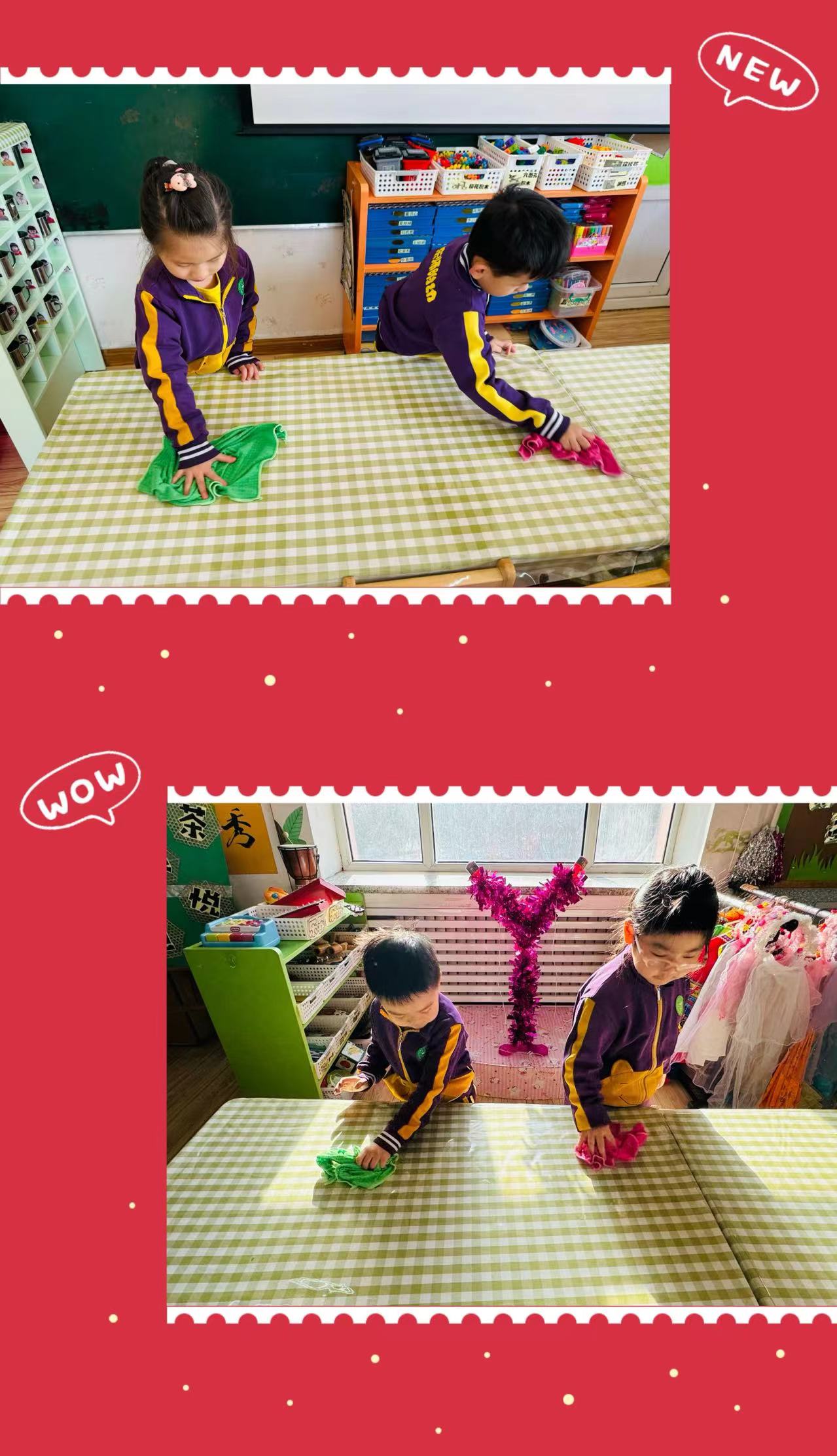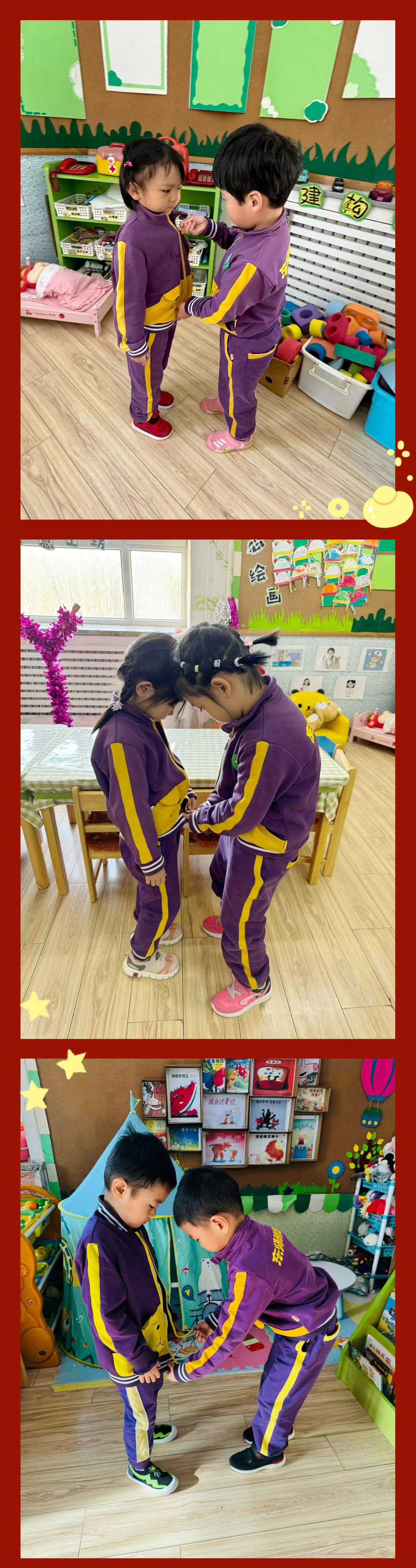 学习雷锋从爱身边的小伙伴、爱班级做起。帮小朋友穿衣服、收拾玩具、擦桌子,在活动中孩子们互相帮助,团结合作,共同体验着帮助别人、美化班级环境而带来的快乐。