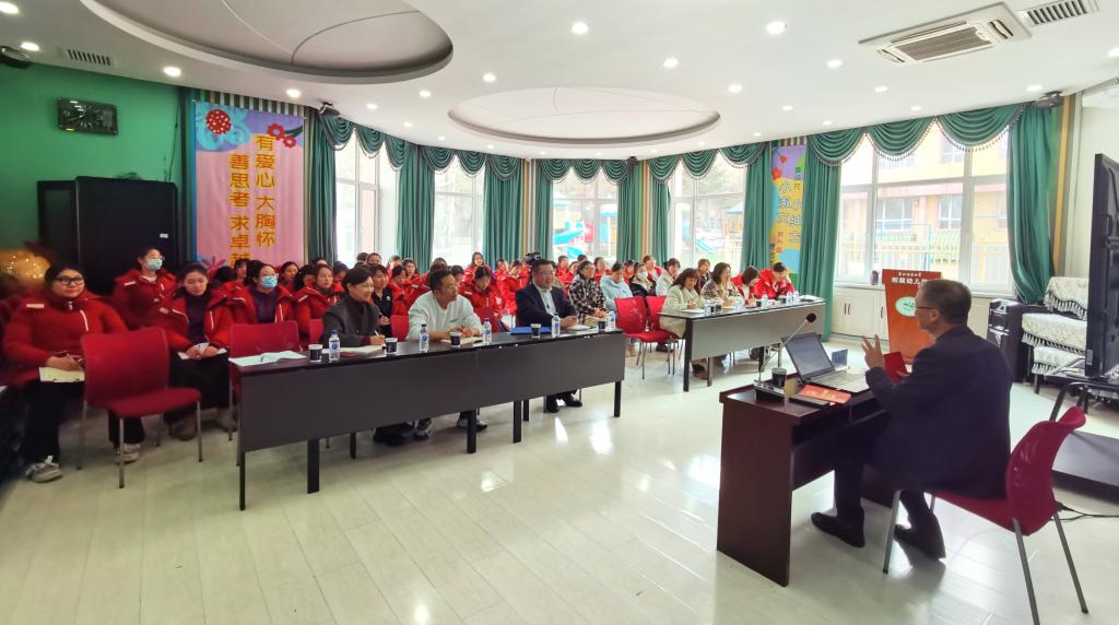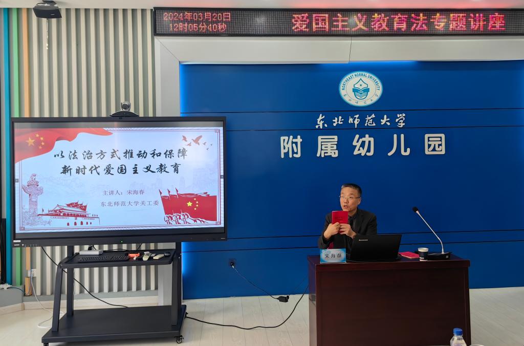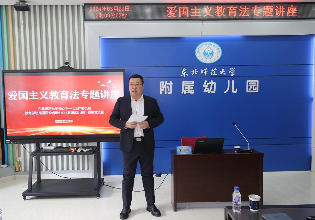 为深入学习贯彻《中华人民共和国爱国主义教育法》,对教师进行爱国主义教育,传承和弘扬爱国主义精神,3月20日,教育部幼儿园园长培训中心(附属幼儿园)直属党支部在学校关心下一代工作委员会的大力支持下,邀请政法学院宋海春教授作了题为《以法治方式推动和保障新时代爱国主义教育》的专题讲座,校关工委常务副主任孙建智与幼儿园全体教师一起聆听了讲座。活动由直属党支部书记常佰城主持。