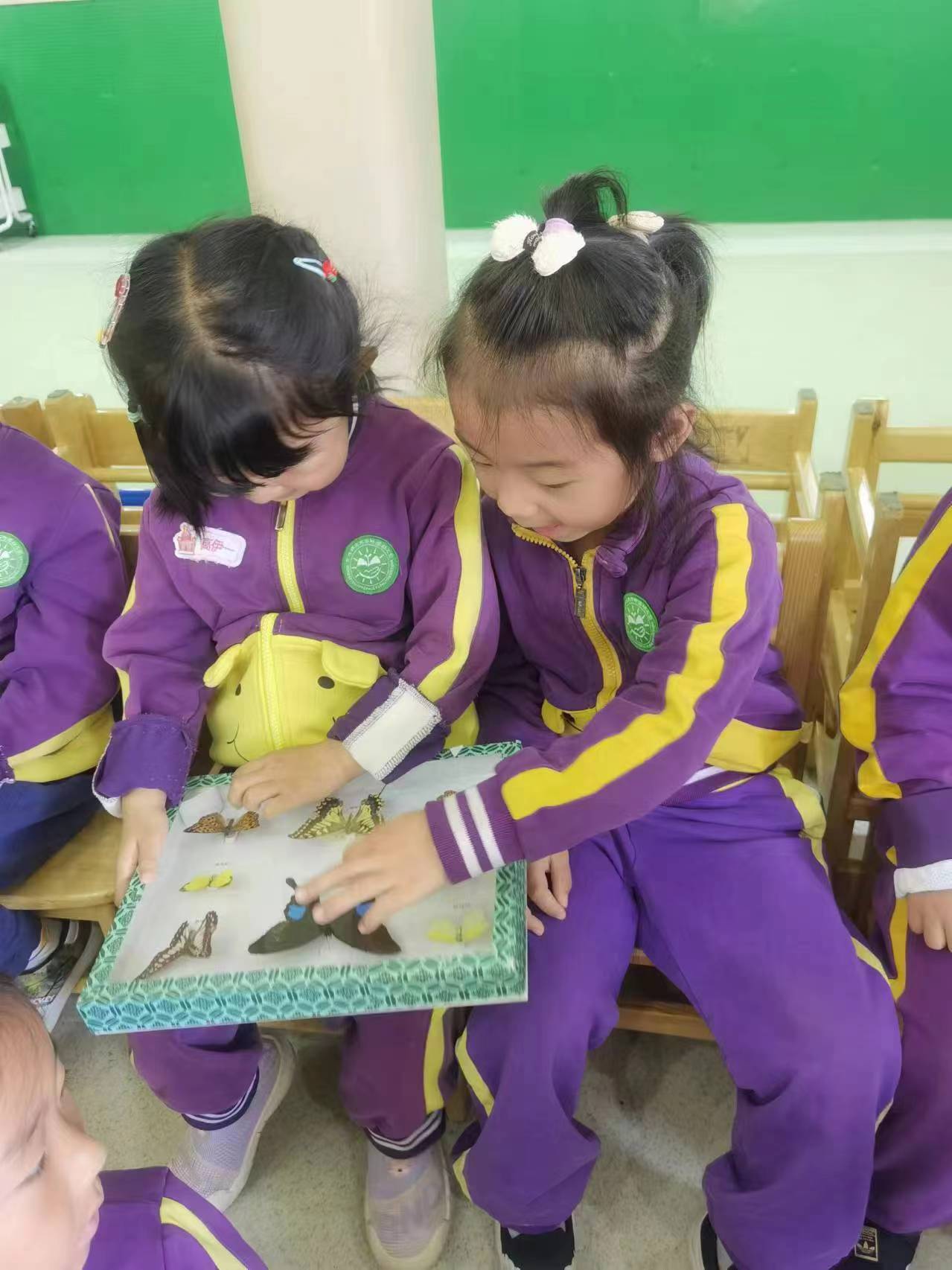 接下来小朋友们了解到地球上已描述生物有170万种,其中昆虫88.5-90 万种 (75%) ,并在满满妈妈的引导下详细的认识身边常见的昆虫,比如:蜜蜂、蚂蚁、苍蝇、蚊子、瓢虫、独角仙、蜻蜓、蝉、蝗虫、蝴蝶。孩子们观看花椒蝶从蛹蜕变成蝴蝶的过程,充满了好奇,眼睛里闪烁着探究的光芒。