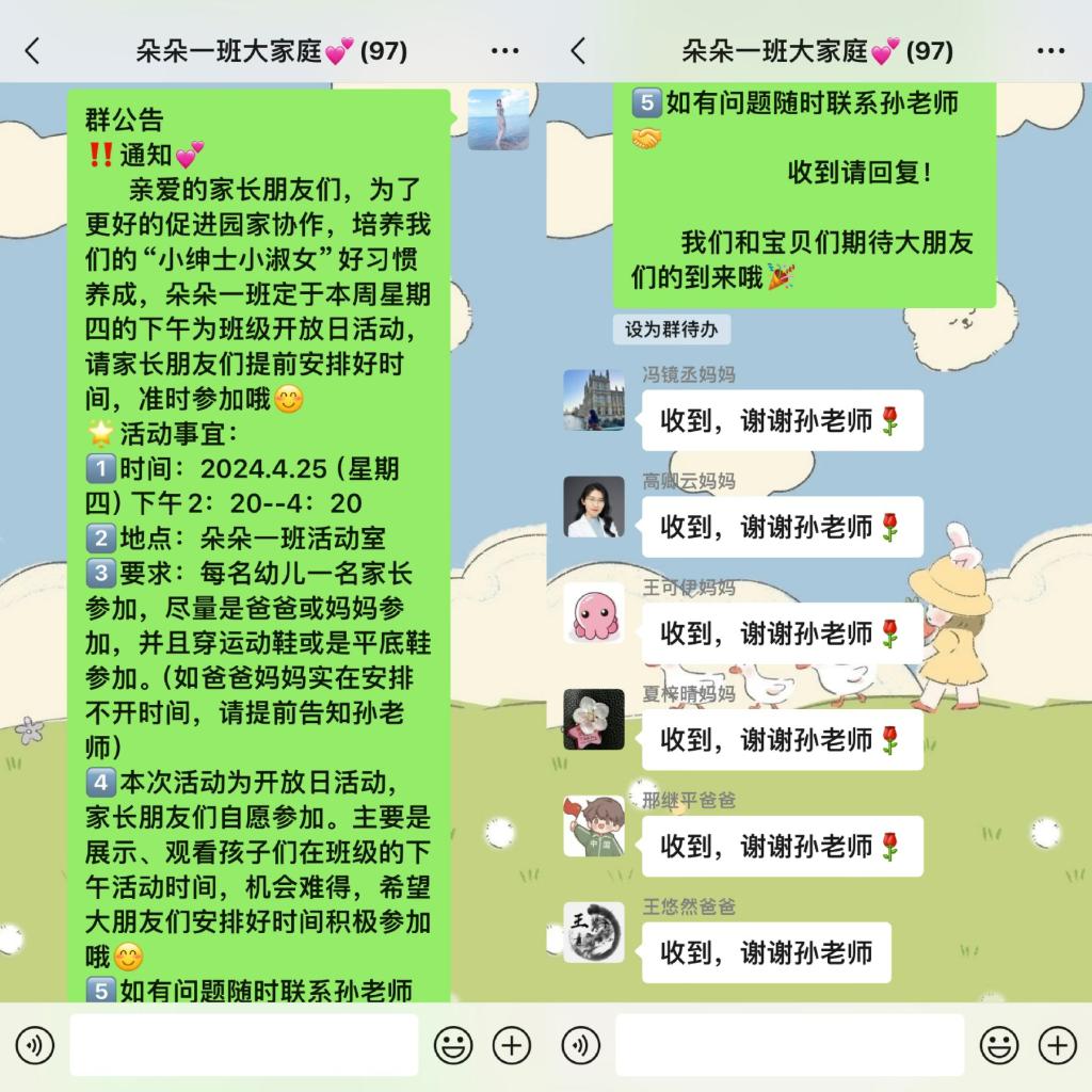 为了让家长更好地了解孩子在幼儿园生活、活动的情况,为进一步深化东师附幼“小绅士、小淑女”好习惯养成,增进幼儿园、教师、家长之间的联系与沟通,更好地达到园家共育目的,2024年4月25日,朵朵一班开展了家长半日开放活动。