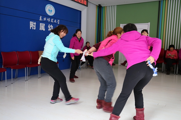 在首先开始的套圈比赛中,中班组以五个圈领先的优势胜出,全组教师击掌欢呼庆祝比赛胜利;接着进行的是抢椅子游戏中,伴随着鼓点和指令各位教师摩拳擦掌互不相让,现场欢声一片好不热闹!而考验内心和细心的系扣子比赛,更是紧张激烈;最后的揪尾巴游戏把整个活动推向了高潮,参与游戏的教师们使出浑身解数保护自己的“尾巴”,并瞄准时机揪下别人的“尾巴”。游戏过渡环节,廖书记及各位领导分别抽取了本次活动的一、二、三等幸运奖,获奖的教师喜悦洋溢在脸上,甜蜜在心中。