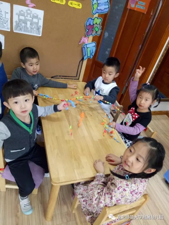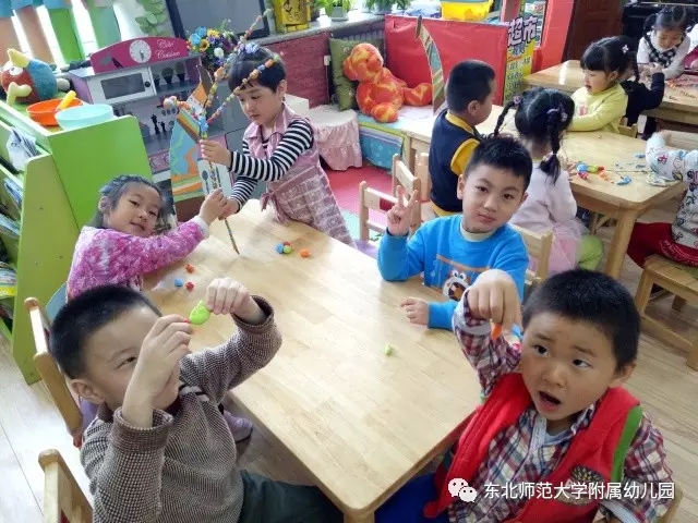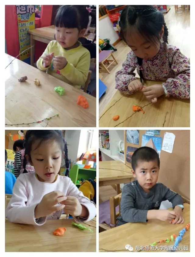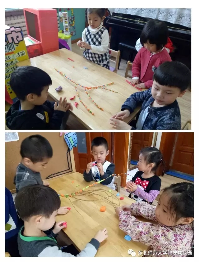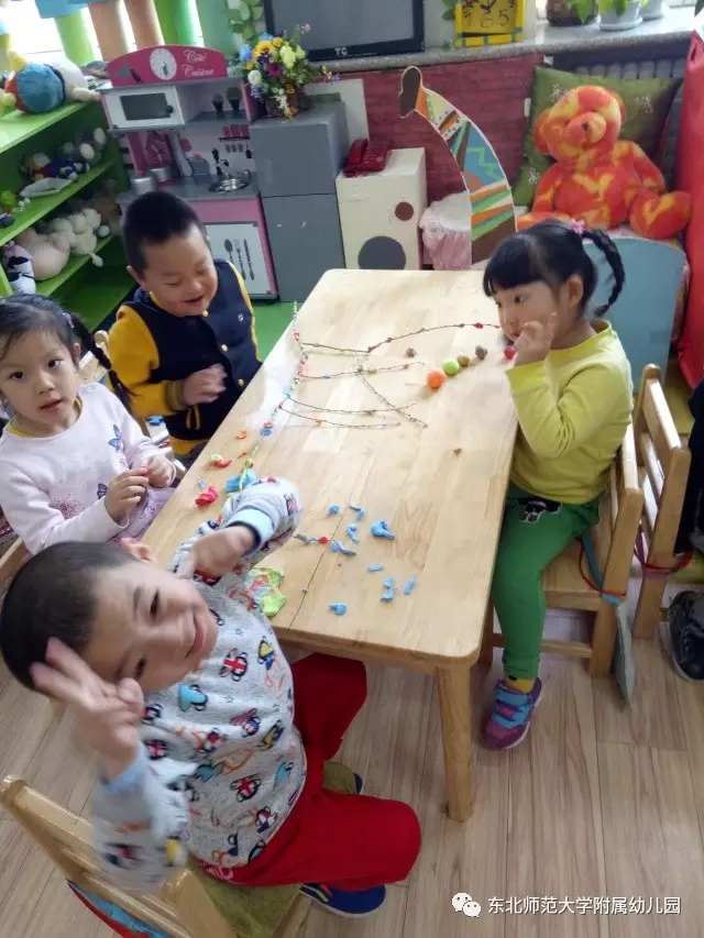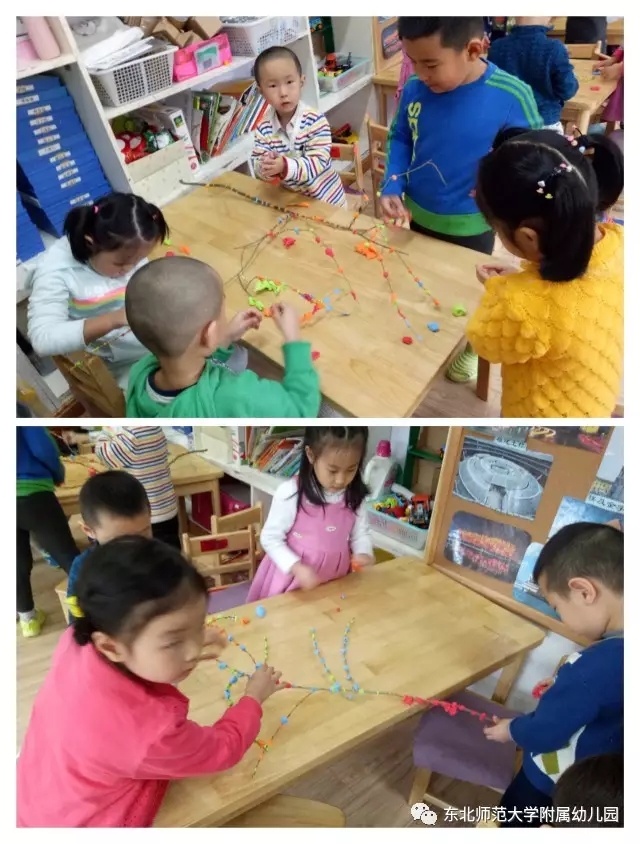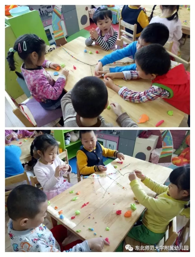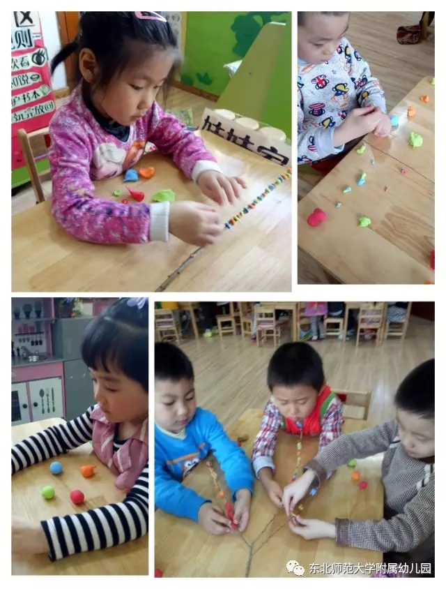利用晚饭后放学前的过渡时间,孩子们洗干净小手,坐在桌边,用各色彩泥细心的装饰着树枝。先把彩泥揪成小块,然后搓长条,绕在树枝上;或者是直接把彩泥搓成球状,顺着树枝的尖端插进去,就像长在树枝上的果子。每组一根大树枝,孩子们装饰的不亦乐乎,有的孩子把各色彩泥混合成红棕色,装饰起来也别有一番风景。放学的时间到了,孩子们把自己的成果展示给家长看,并手舞足蹈的讲着装饰树枝的过程,家长们也满心欢喜,赞叹着:“真是太漂亮了!小手真灵巧!”