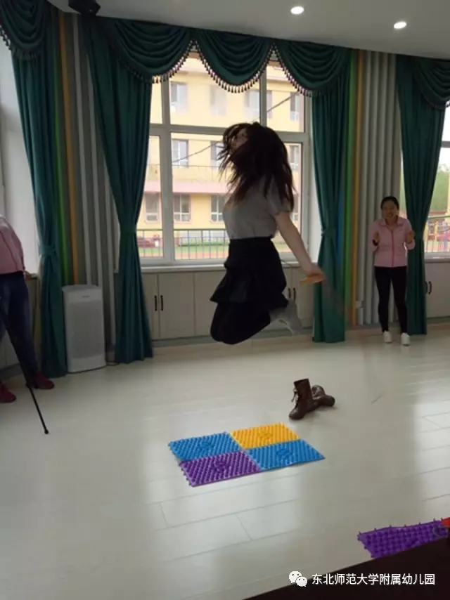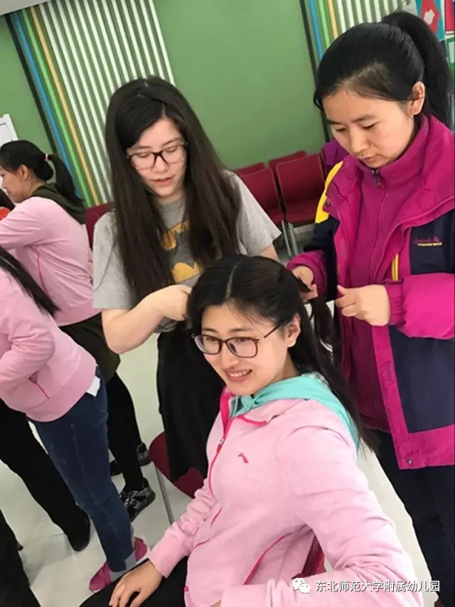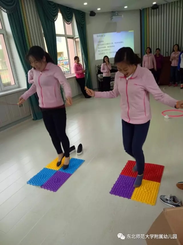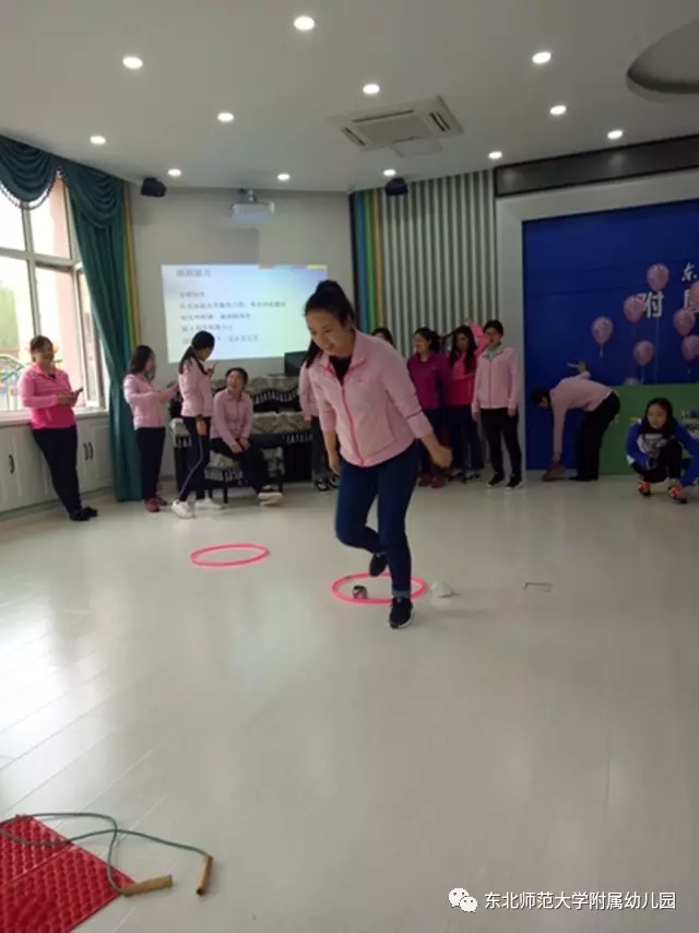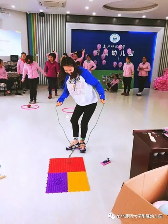 游戏在团委书记张元的组织下开始,通过编头发比赛提升教师的专业技能,根据图片提示的幼儿发型,教师们灵巧的梳出漂亮的发型,纷纷表示回到班级可以给女孩子们尝试新发型了;在障碍比赛中,大家运动起来,通过跳跃、钻圈、指压板跳绳三个游戏增强体质,激烈的竞技把游戏推向高潮;最后的找宝游戏,教师们熟悉了幼儿园的各个角落,找到了园内带有幼儿园园徽的图片,在欢声笑语中结束了本次的活动。