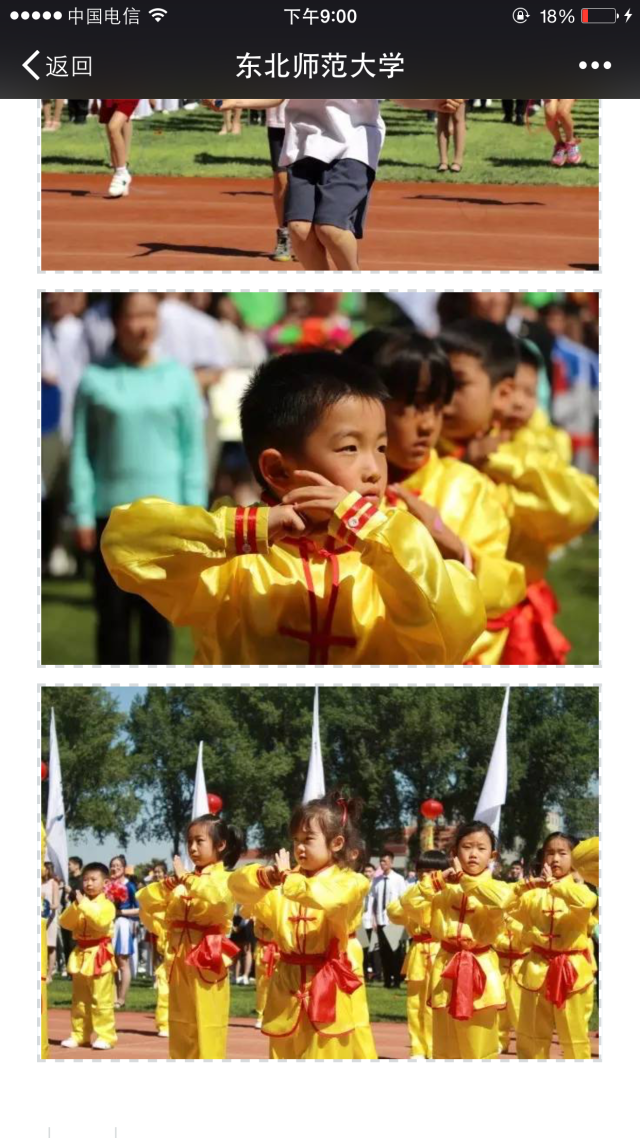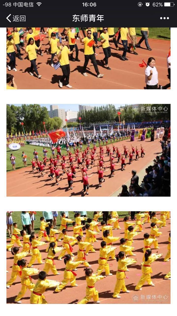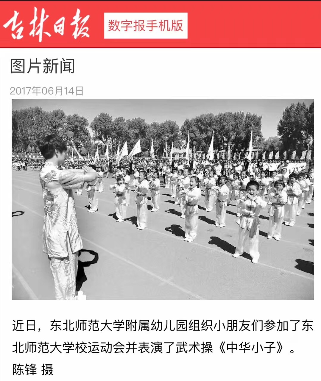本次开幕式检阅,我园教师幼儿代表队为全校师生带来了一场精彩纷呈的视觉盛宴,武术表演《中华小子》受到《人民网》、《吉林日报》、东北师范大学微信公众平台、东师青年微信公众平台等媒体关注。