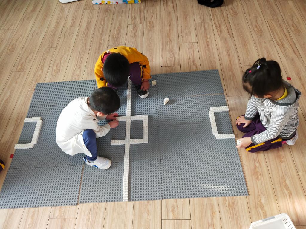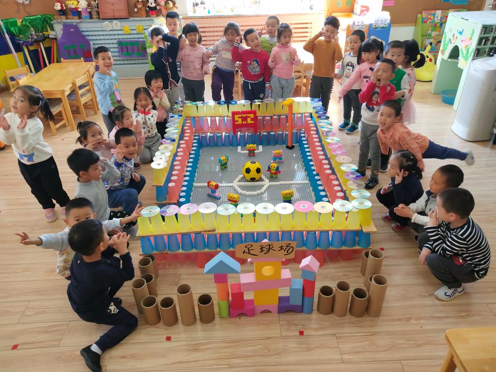小朋友们兴致勃勃的搭建起来,有的小朋友还一起商量:“我从这边搭,你从那边搭,我们合作围成一圈,这样搭得块!”在小朋友们的共同努力下,朵朵一班的体育场终于搭建完成!小朋友们都高兴的欢呼着,脸上挂着自豪的笑容。