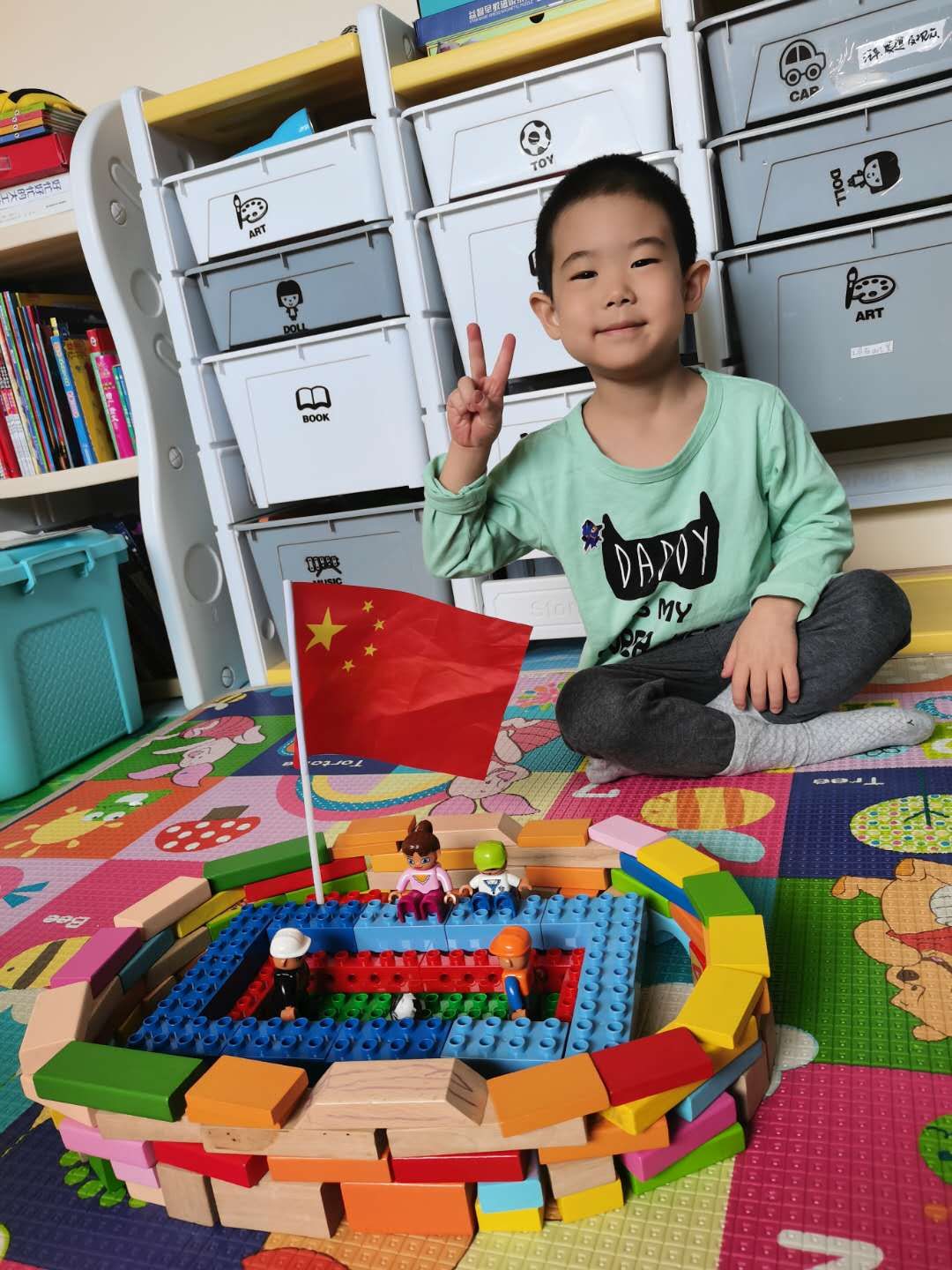 “我用积木搭建了鸟巢弧形的外观,中间是比赛场地,四周是看台,我还插了一面五星红旗呢。”
