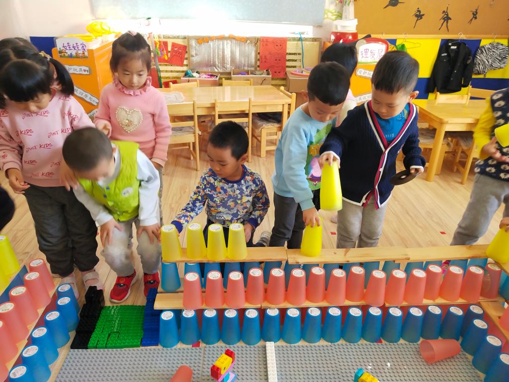 由于杯子很轻,稍有不慎,好不容易垒高的杯子一碰就坍塌。所以在搭建体育场的过程中,孩子们都小心翼翼的,摆放杯子时仔仔细细的。在搭建过程中三层高的杯子被碰倒了两次,看到即将完成的作品一次次坍塌,小朋友们的神情中满是失落。即使遇到挫折小朋友们也没有放弃,重新投入到搭建中。