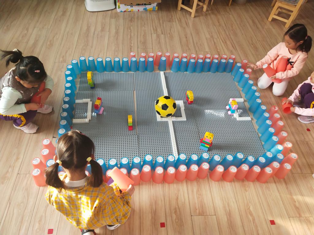 小朋友们兴致勃勃的提出:“搭建体育馆首先要有足够大的场地,在两端摆放好球门的位置。”