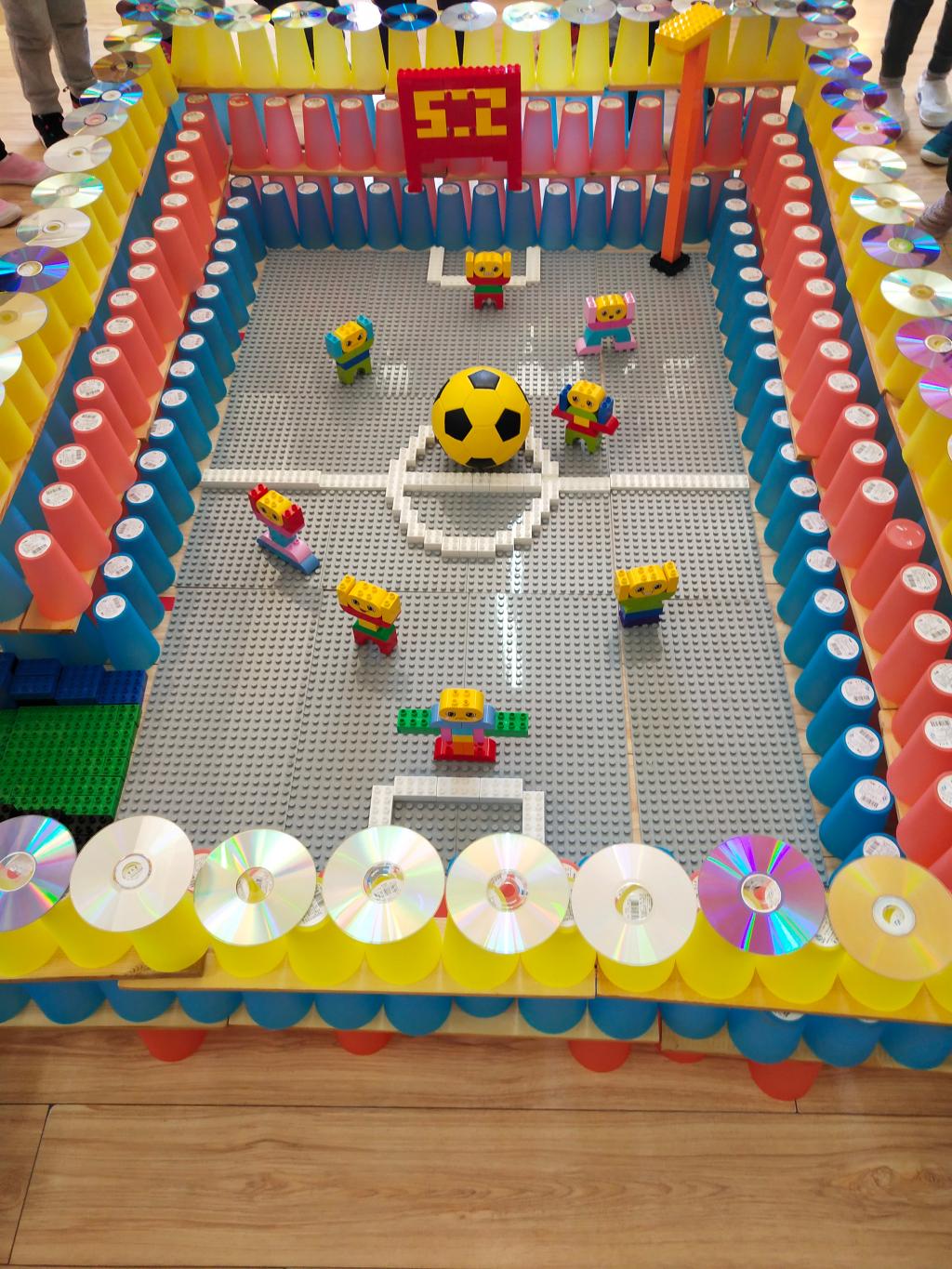 注重细节的小朋友跑过来跟我说:“老师,体育馆要有大屏幕,上面有比分,我们才能知道哪一队获胜了呀,我想做一个1:1,他们都得了一分可以吗?”