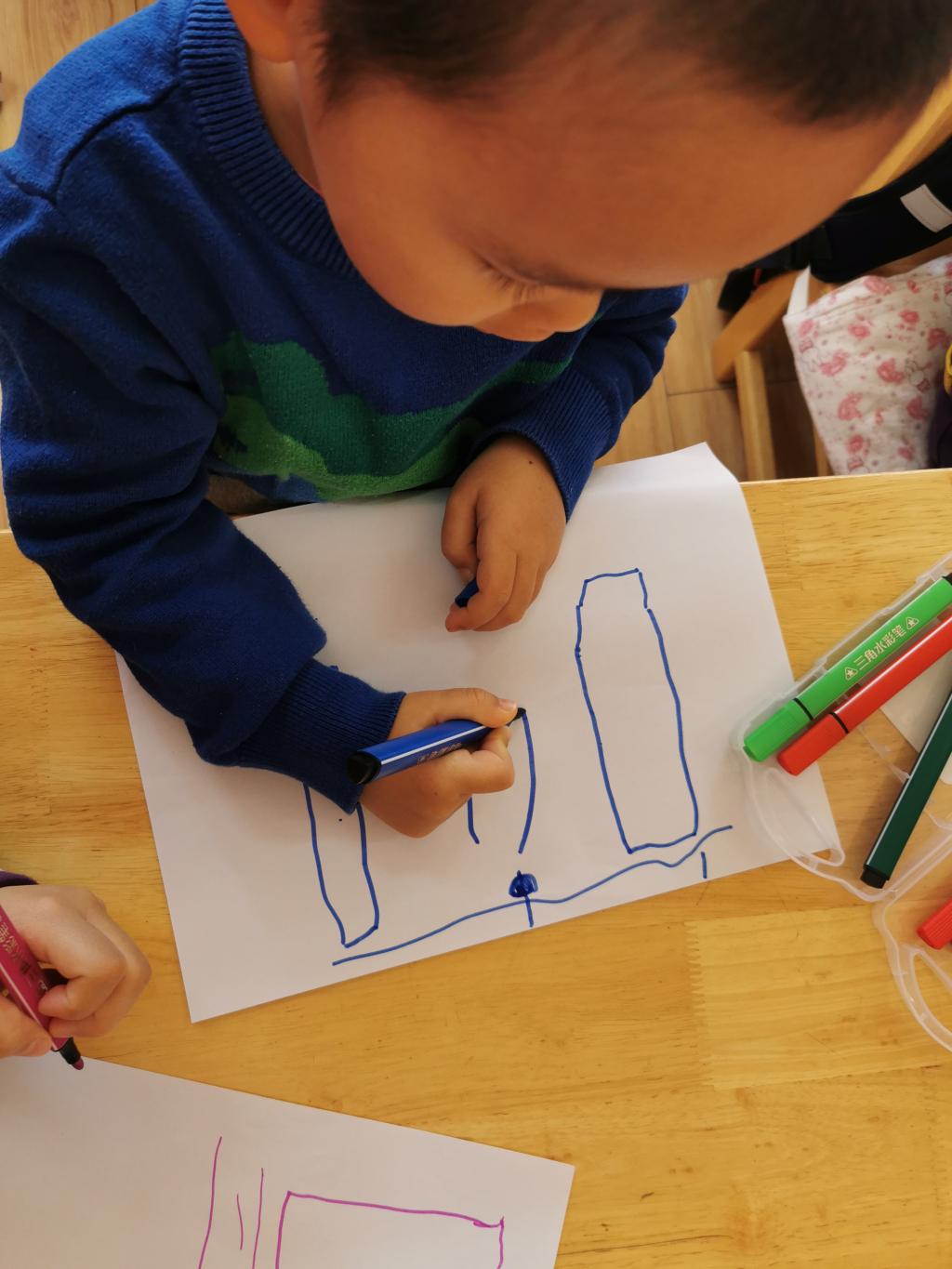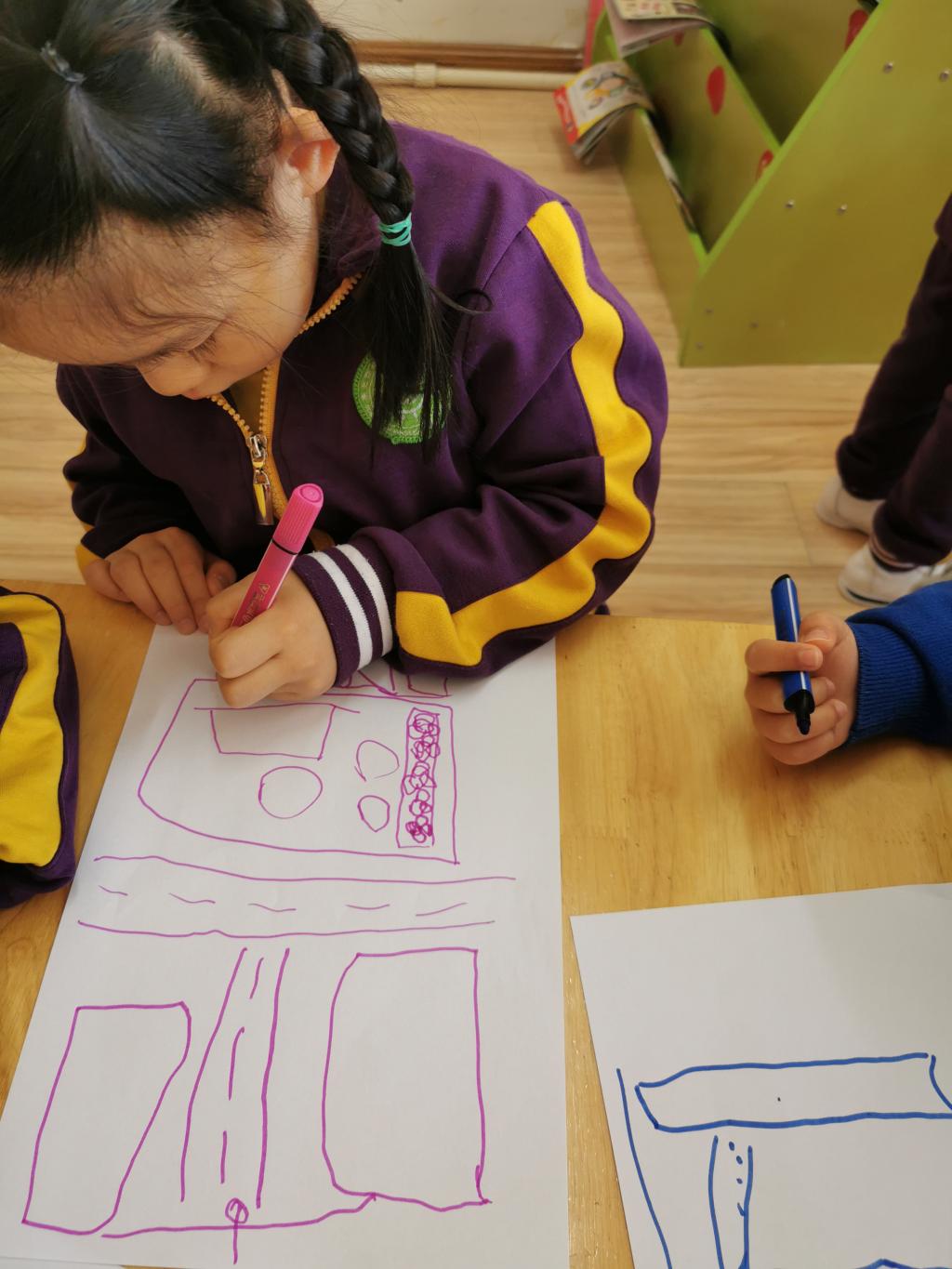 孩子们想要设计出自己眼中的“一汽大厦和厂房”,大家一起对大厦和厂房的位置、结构、布局和大小等进行了认真的观察。然后利充分发挥想象力和创造力,动手绘制出一张张属于自己的结构图,他们一起分享和交流,共同设计出我们朵朵三班“一汽大厦和厂房”,这里包含了每一名幼儿的想法和创意。