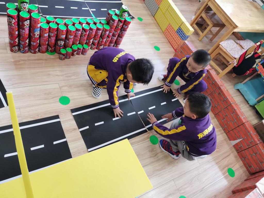 搭建工作开始了,小朋友们各自分工,有的小朋友对材料进行分类和整理,有的参与搭建路面设计,有的搭建工厂周围的小广场......他们共同合作,加强彼此间的交流,而且创意不断,他们的奇思妙想在建构中得以充分的展现,孩子们在小小的建构活动中得到了大大的收获。