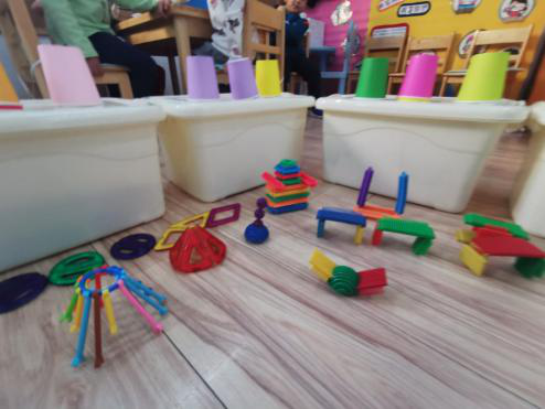 教室里面各种各样的建构材料激发了幼儿建构的兴趣,他们开始开始创意搭建自己心中的沙池。