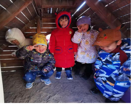 小朋友们在建构的过程中,自主讨论商议、大家如何分担、如何分工进行建构。不同分组的幼儿负责不同的部分,在全体小朋友们的共同努力下,“沙池游乐场”逐步完成了。他们相互配合,使用不同的游戏材料,共同合作完成了建构,良好的同伴关系以及社会性得以充分发展。