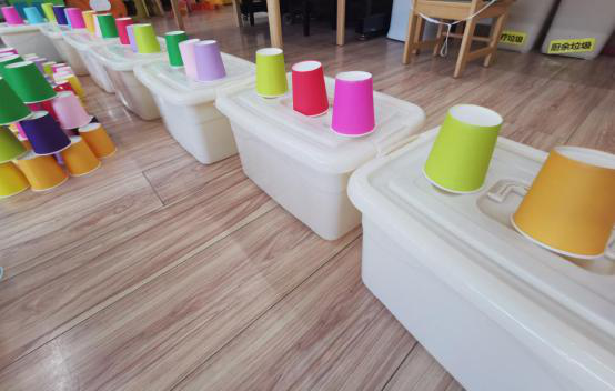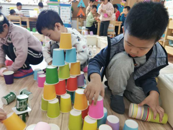 在建构游戏中,好几组的小朋友选择的材料是彩色的纸杯,但是大家的建构方法都不同。