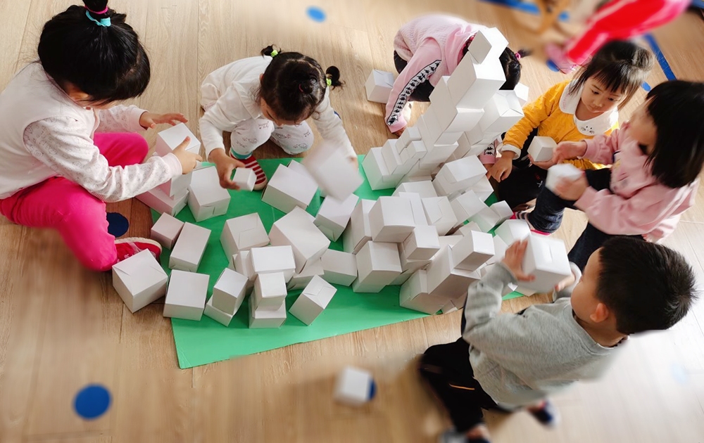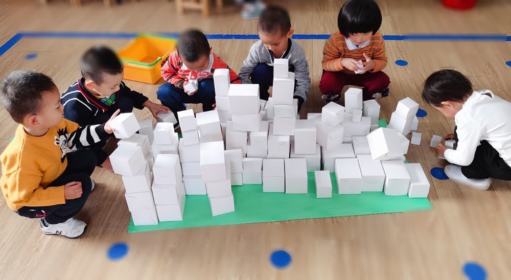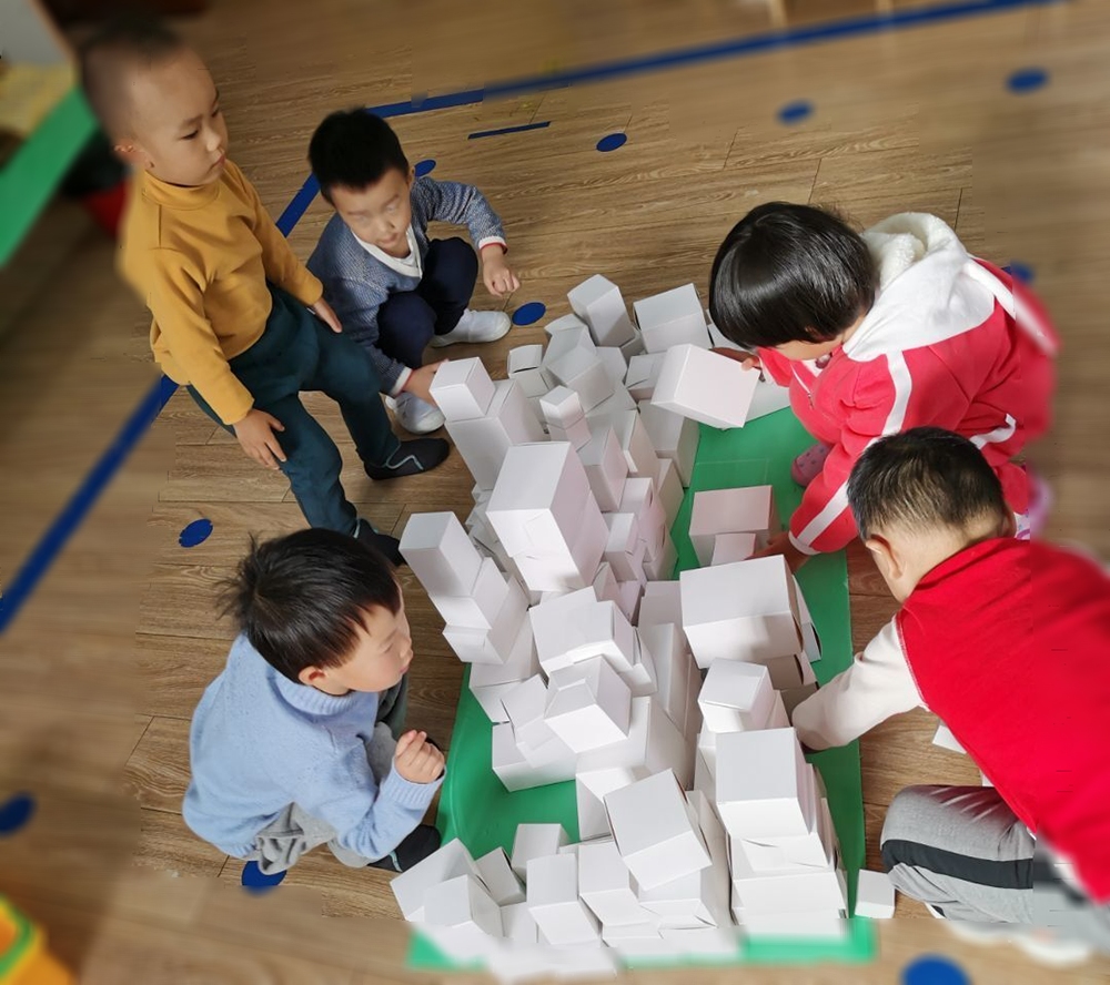 第一组小朋友负责地基的搭建,宝贝们为幼儿之家设计出独特的“贪吃蛇”形状,创意来源于户外体育游戏“好大的贪吃蛇”。