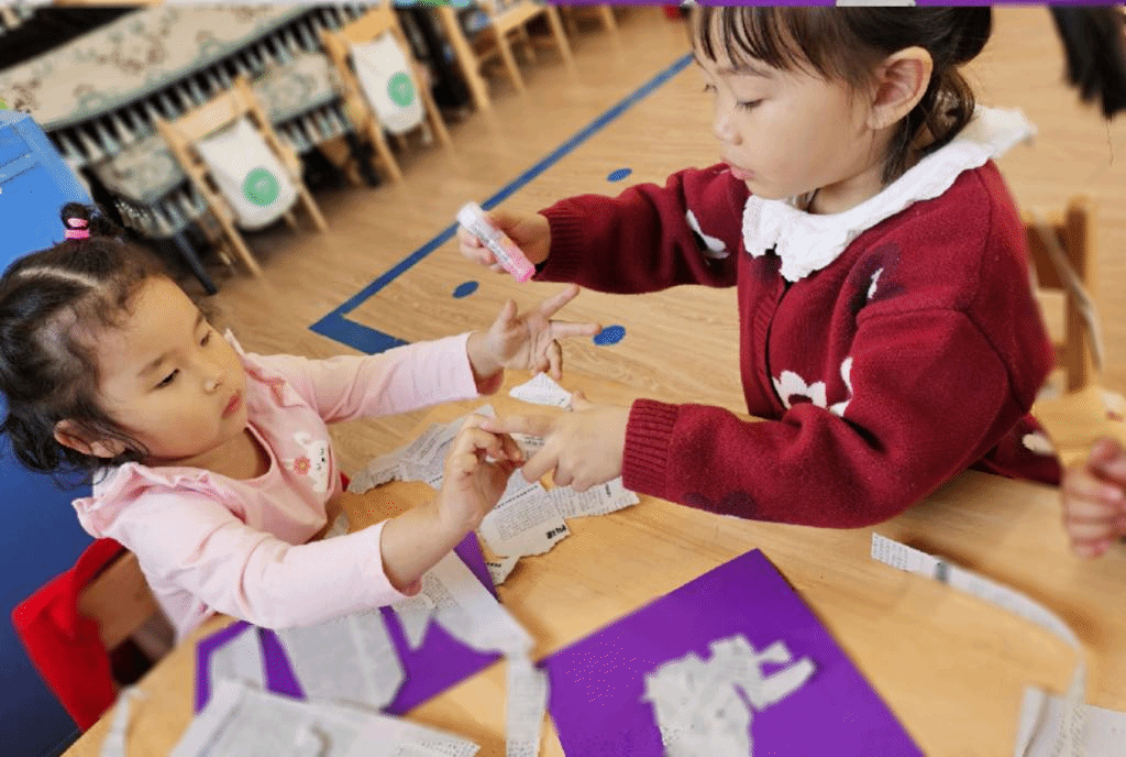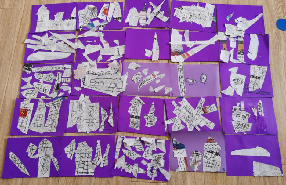 活动结束后,宝贝们对幼儿之家的建设热情还很高涨。于是,老师为小朋友们准备了废旧报纸,宝贝们又开始了“梦想大厦”的建设。小巧的双手撕出不同的形状,再粘贴、装饰。