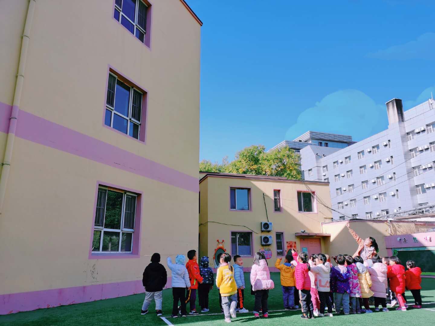 最后,粘贴了门窗,楼房周边装饰了大树,在宝贝们的巧手搭建下,我们的作品终于完成啦!快和我们全组宝贝们的成果合个影吧!