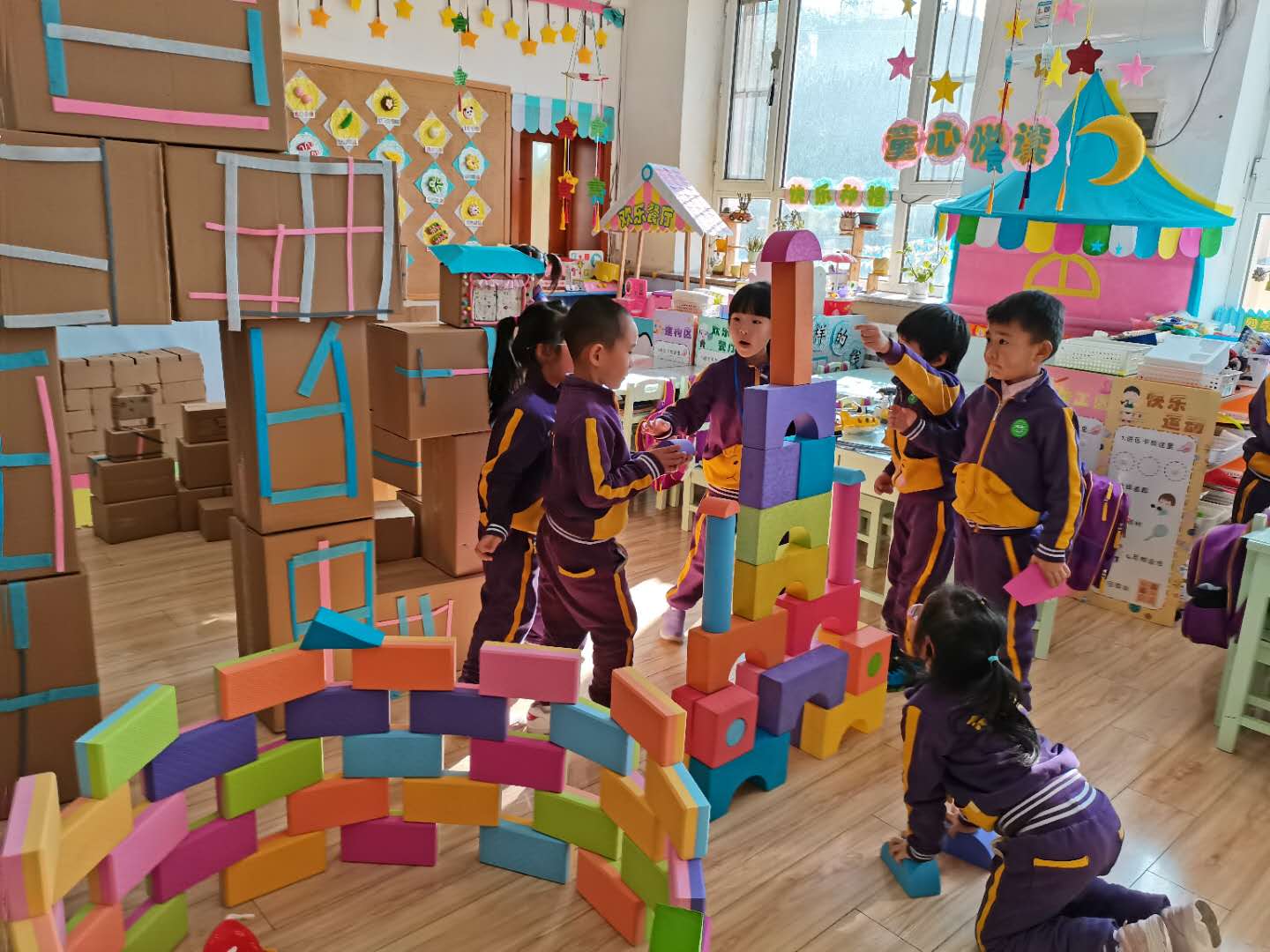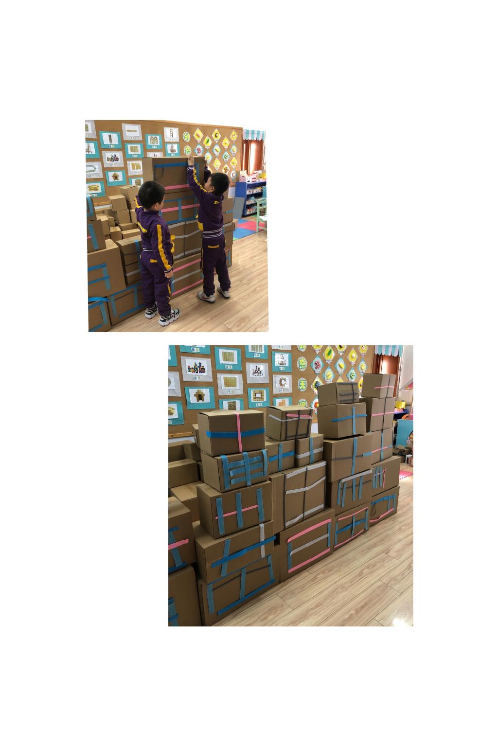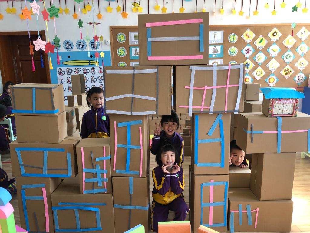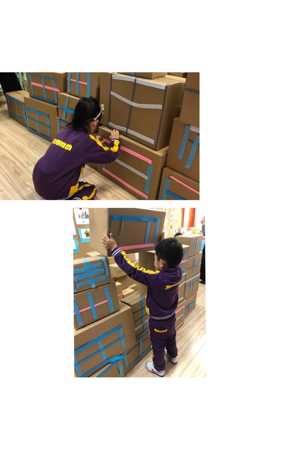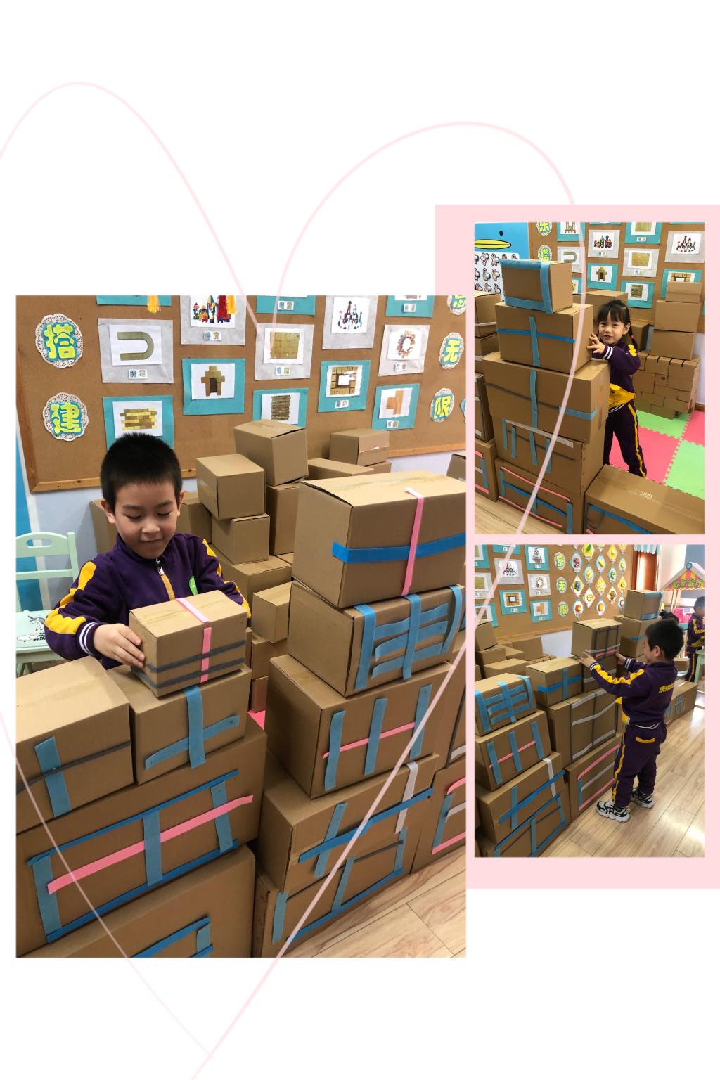 钰轩说:“太喜欢和纸箱一起玩啦,我能能一起搭一个特别大的房子。”