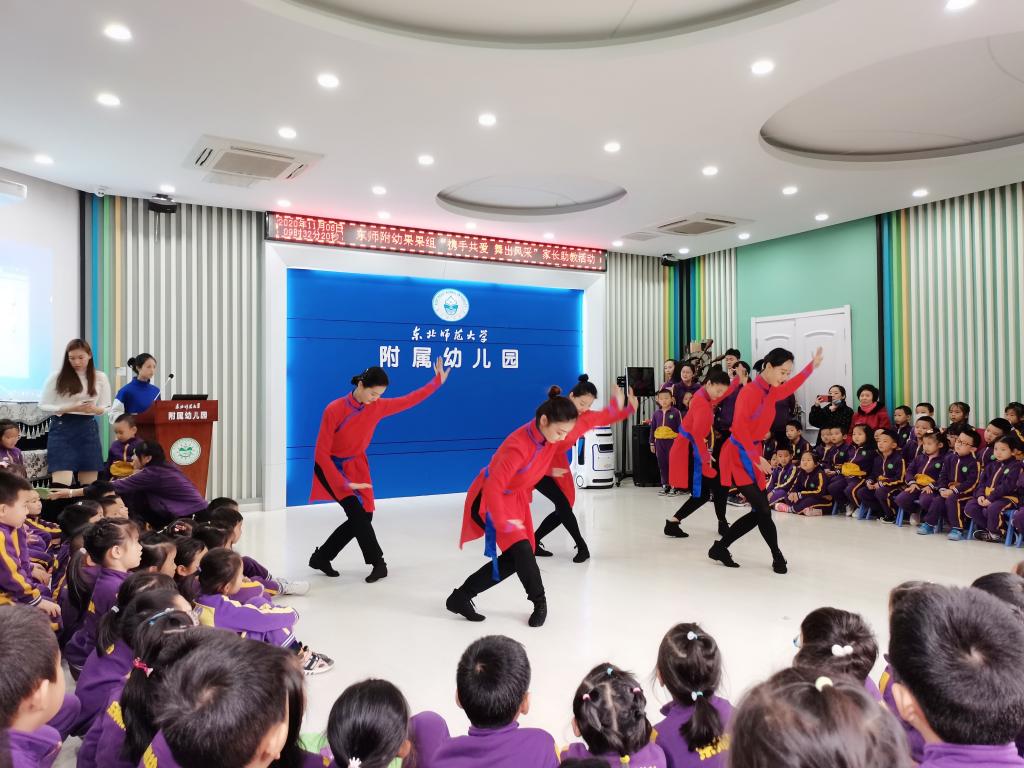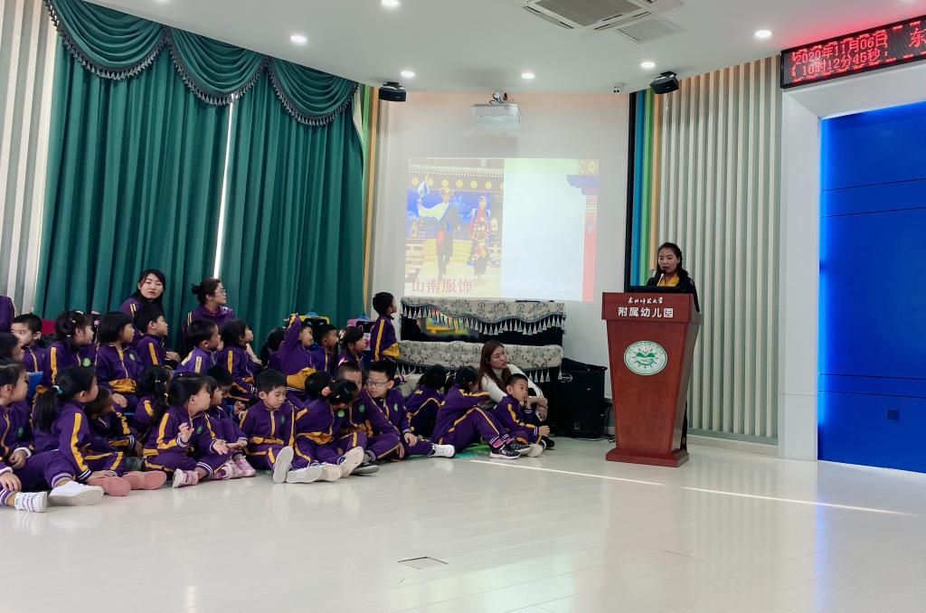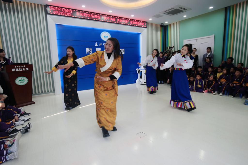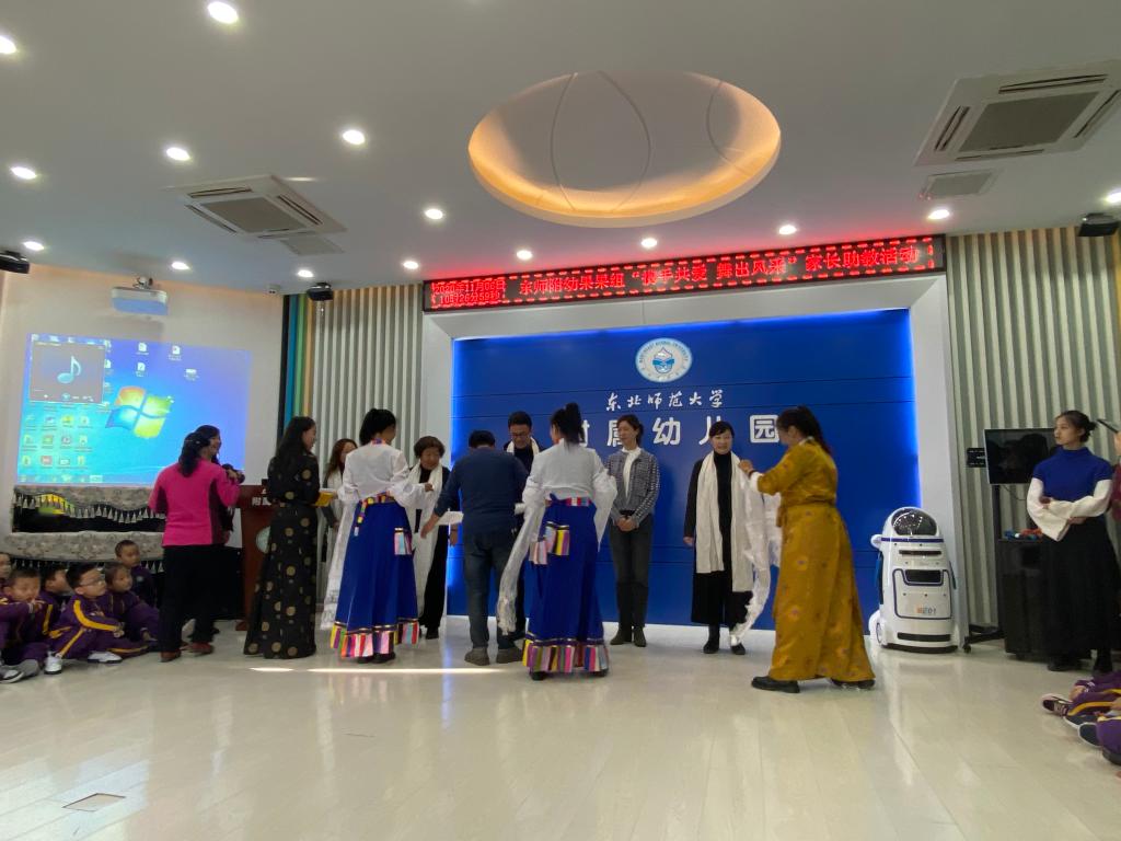 此次活动,来自西藏日喀则地区的跟岗老师也为小朋友们介绍了西藏各地区的民族服装、饮食和地域特点。为小朋友们表演她们幼儿园小朋友的舞蹈,并为幼儿园献上洁白的哈达,送上祝福和敬意。