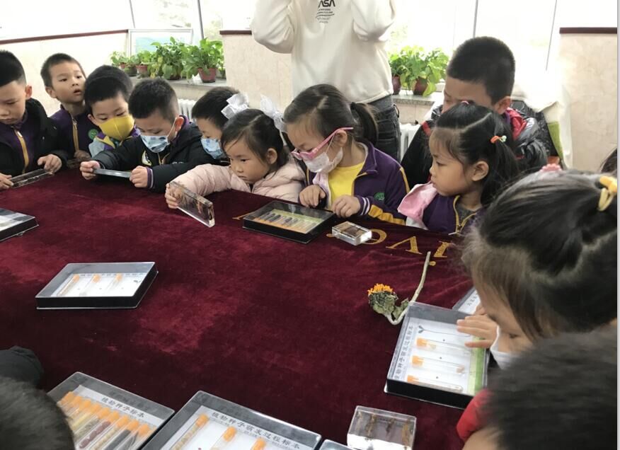 在地理楼的最后一站小朋友们观察并学会区分了水稻、小麦、大豆、青稞、小米等主要的粮食作物,知道粮食对人类生存的重要意义;通过黄豆发芽标本了解植物生长过程,黄豆的生长过程主要分为播种、萌芽、出苗、抽叶这四个步骤。首先将浸泡好的黄豆播种到潮湿的土壤中,种子的外表会变淡,种皮也会稍微裂开一些。大约两天之后,黄豆从种皮里面就会长出淡黄色的嫩芽来。再过五天以后黄豆就会生长出对称的叶片,进行光合作用。通过上述讲解,小朋友们认识到农民伯伯种植植物的辛劳付出,懂得珍惜粮食要节约不浪费。