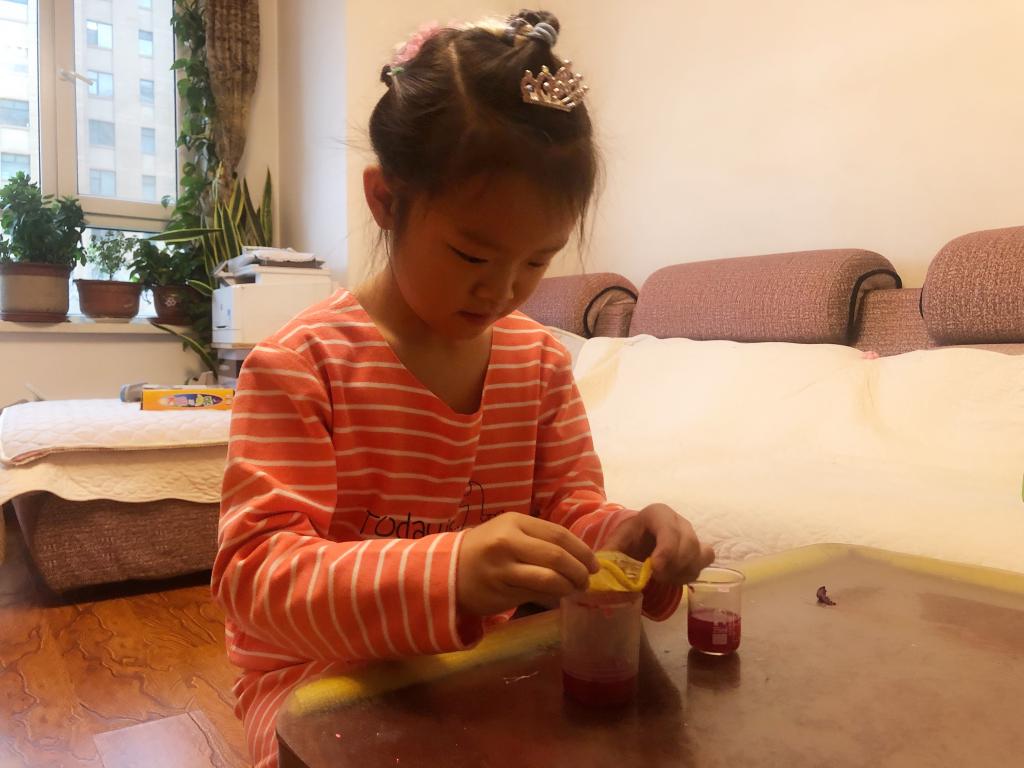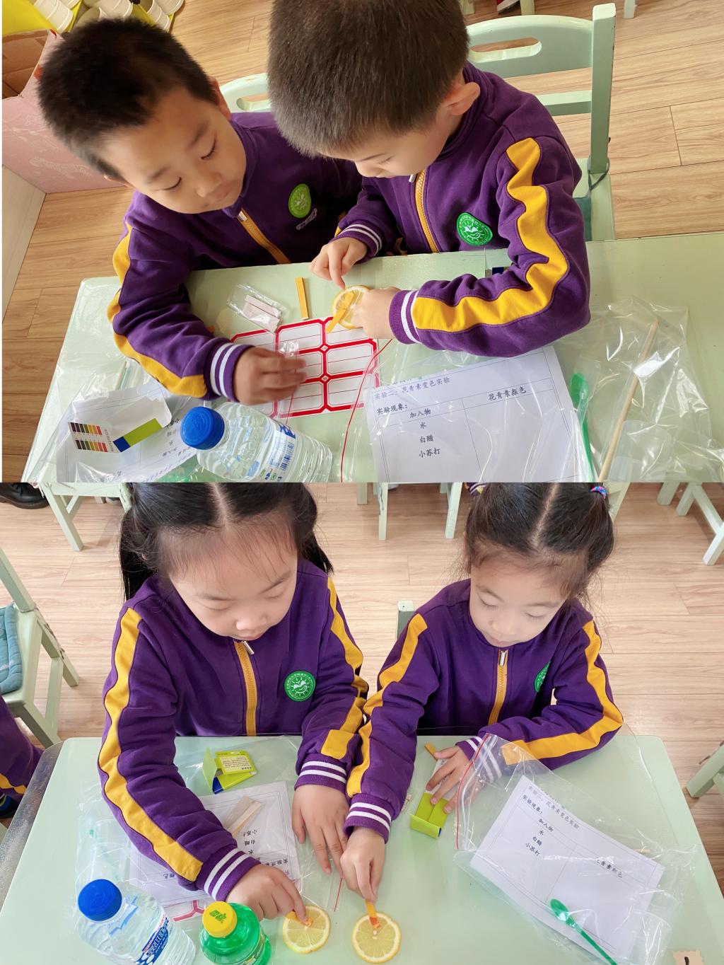 有了前期实验经验的积累,孩子们还利用花青素代替pH试纸来检验食物的酸碱性。他们认真观察花青素在酸碱条件下的颜色变化,并展开了热烈讨论,认真记录,积极和小伙伴们探讨在食物中获取花青素的方法。
