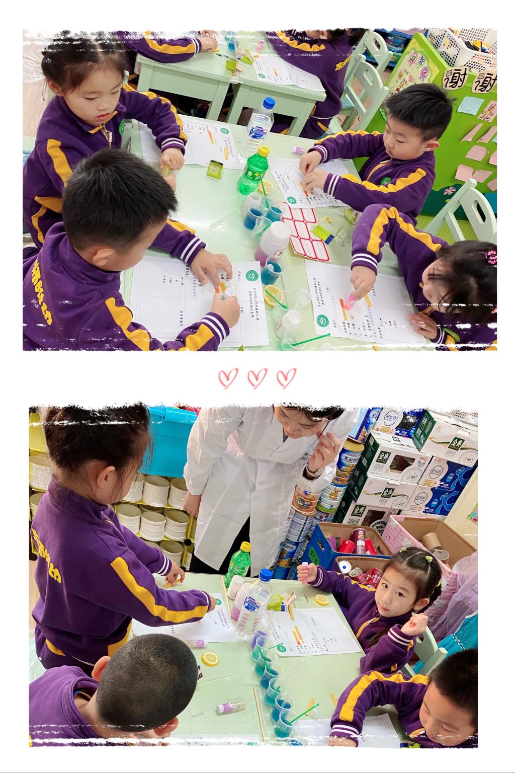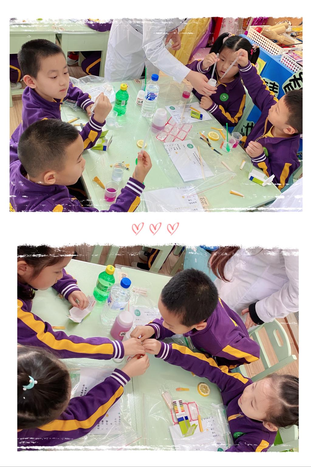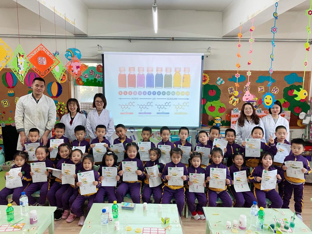 活动邀请了许菡小朋友的妈妈带着研究生来到班级,为孩子们讲解和演示实验原理。幼儿自己动手操作,探索食物中的酸碱变化。