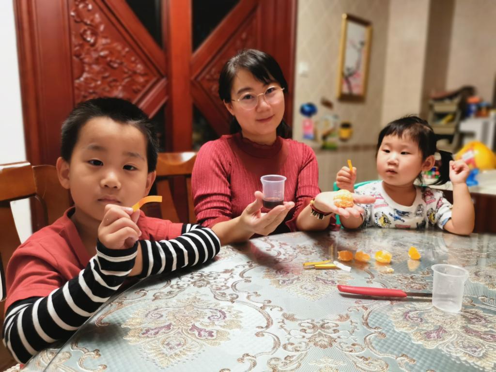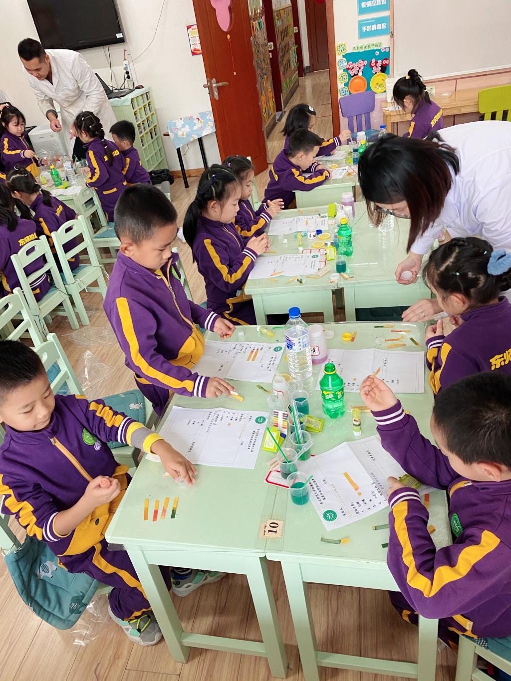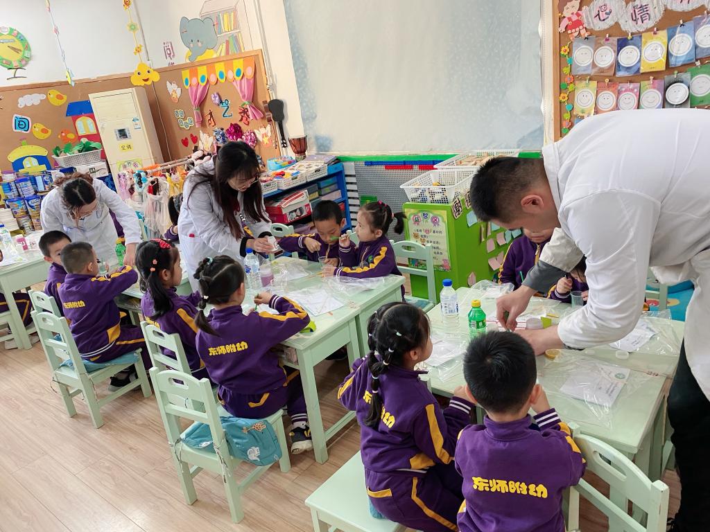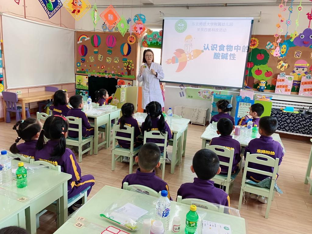 活动邀请了许菡小朋友的妈妈带着研究生来到班级,为孩子们讲解和演示实验原理。幼儿自己动手操作,探索食物中的酸碱变化。