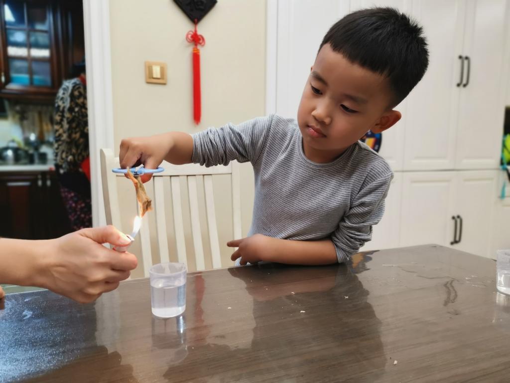 对于探索酒精燃烧的奥秘,孩子们意犹未尽,带着浓厚的兴趣,回到家中和爸爸妈妈一起再次探索。