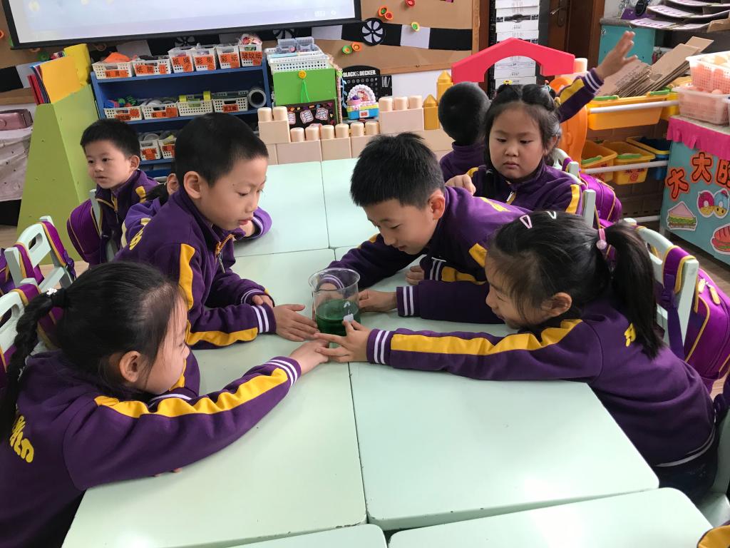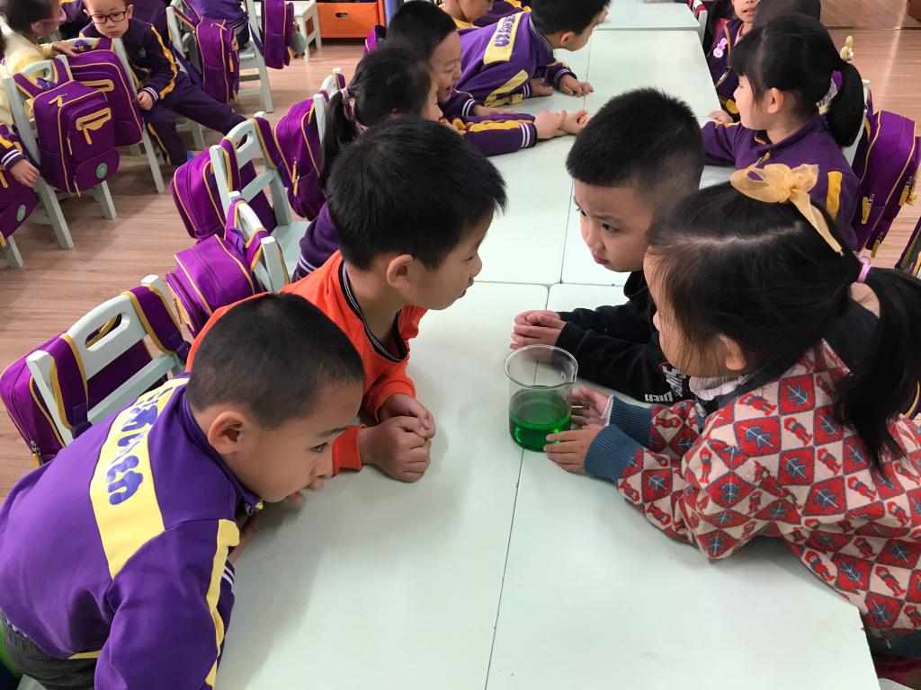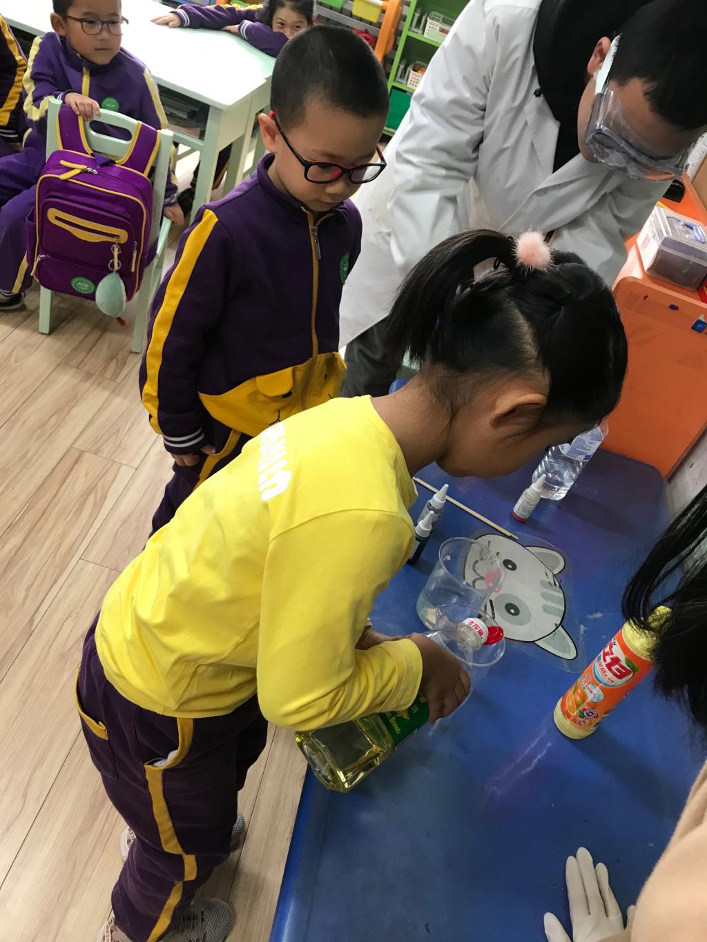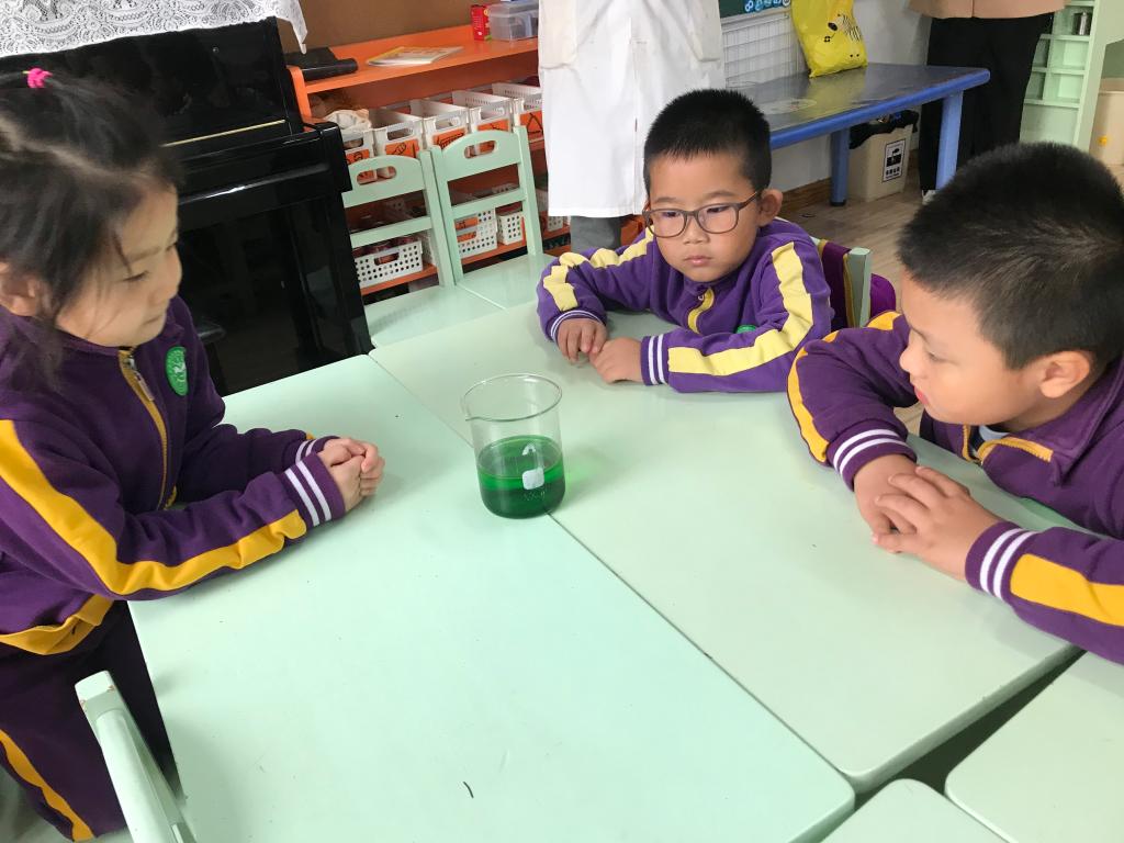 通过哥哥的讲解和操作,孩子们知道了利用油的密度大,沉降的时候带着色素一起往下沉,所以油变成了绿色。
