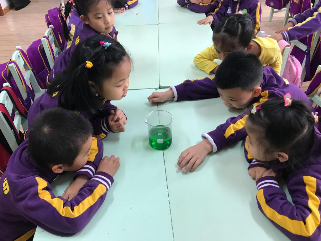 咦!快看它怎么变颜色了呢?油变成了绿色的。它是怎么变成绿色的?孩子们好奇极了,于是大哥哥边讲解边告诉小朋友“油”为什么会变成绿色的。