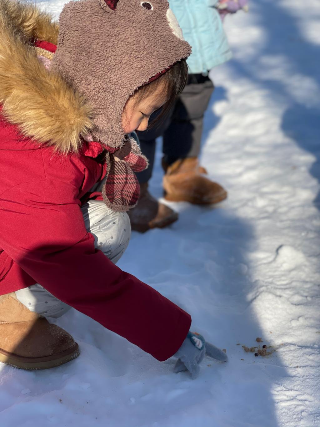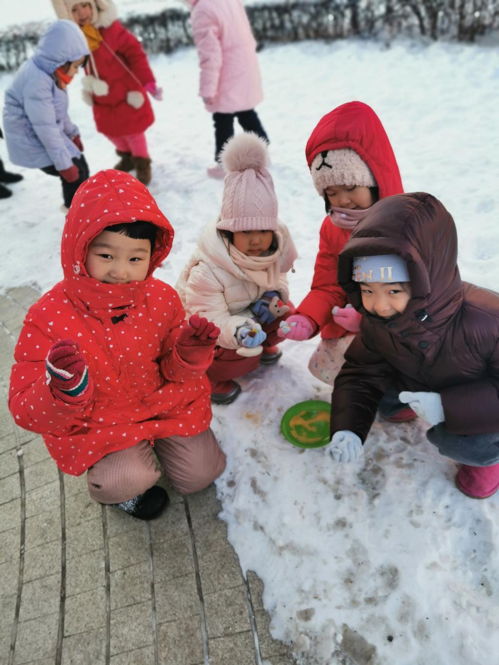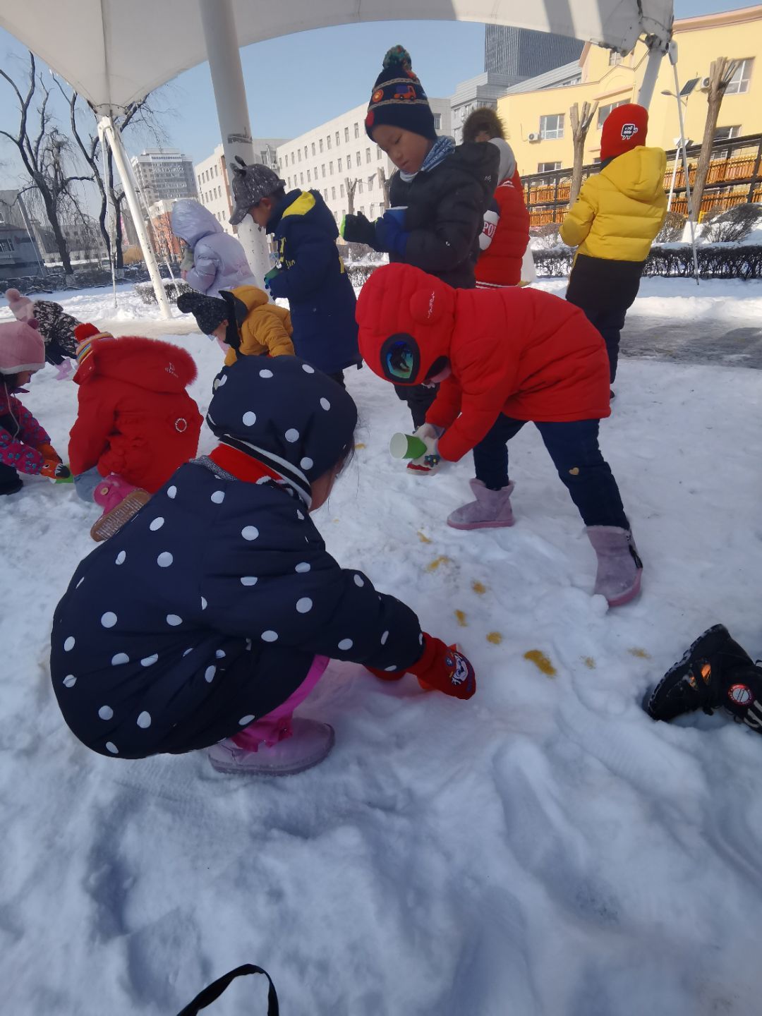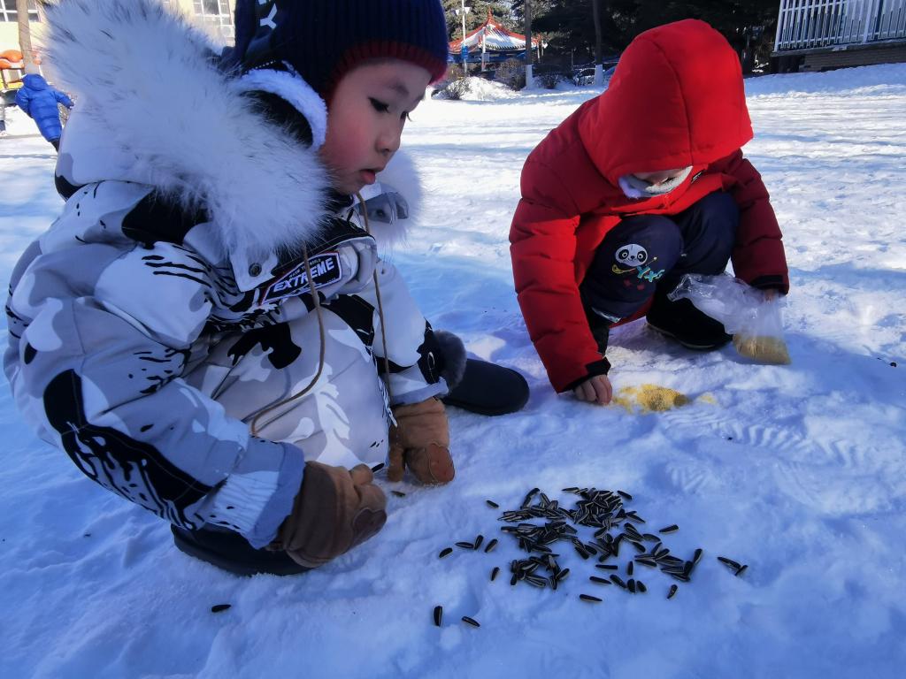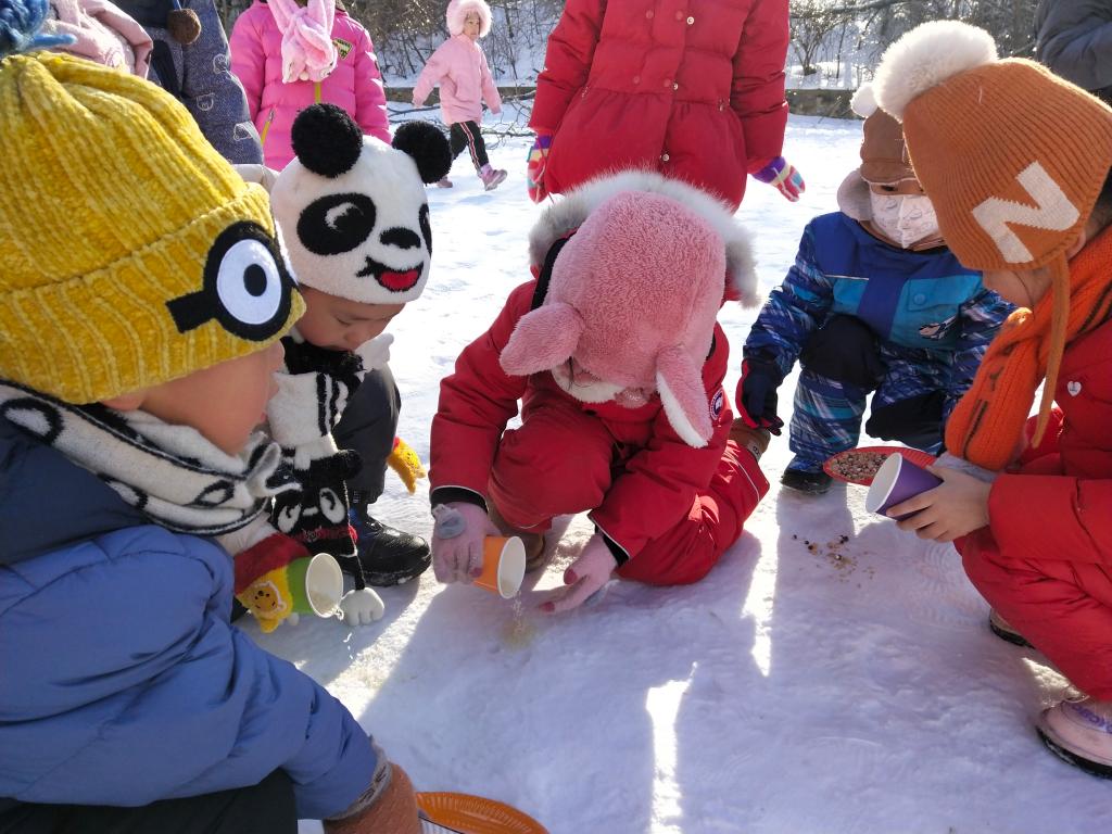 把它们投放到幼儿园的迷宫中、小菜园里、师大草坪上、灌木丛中,孩子们在雪地里踩出一个个小坑,细心的把食物倒在坑里。