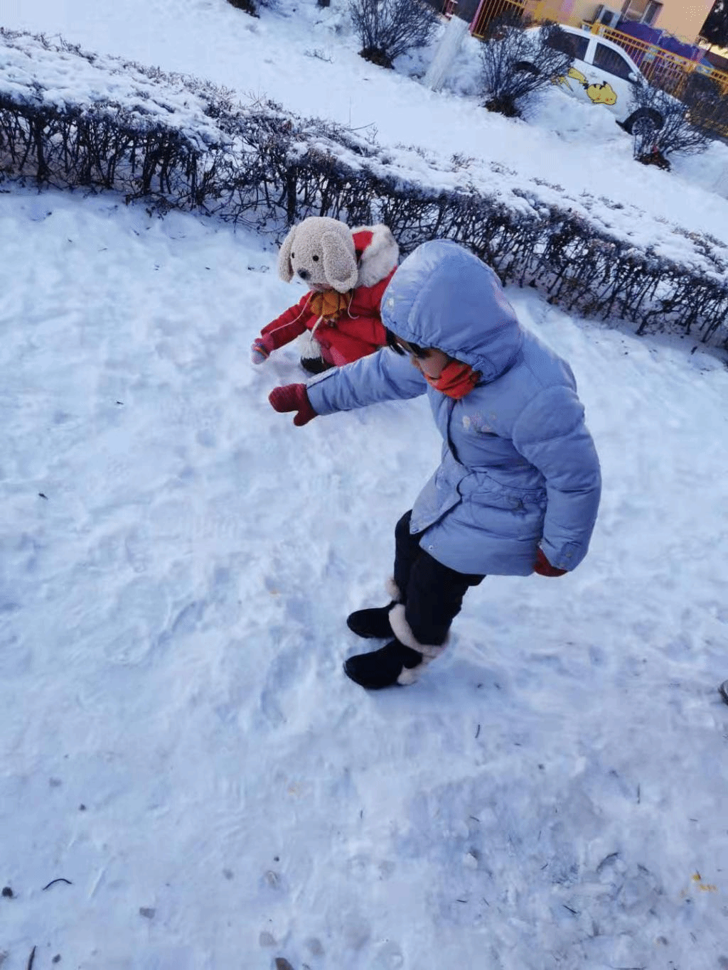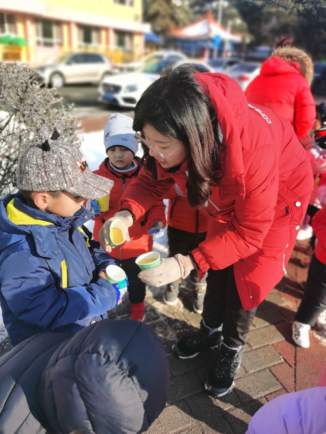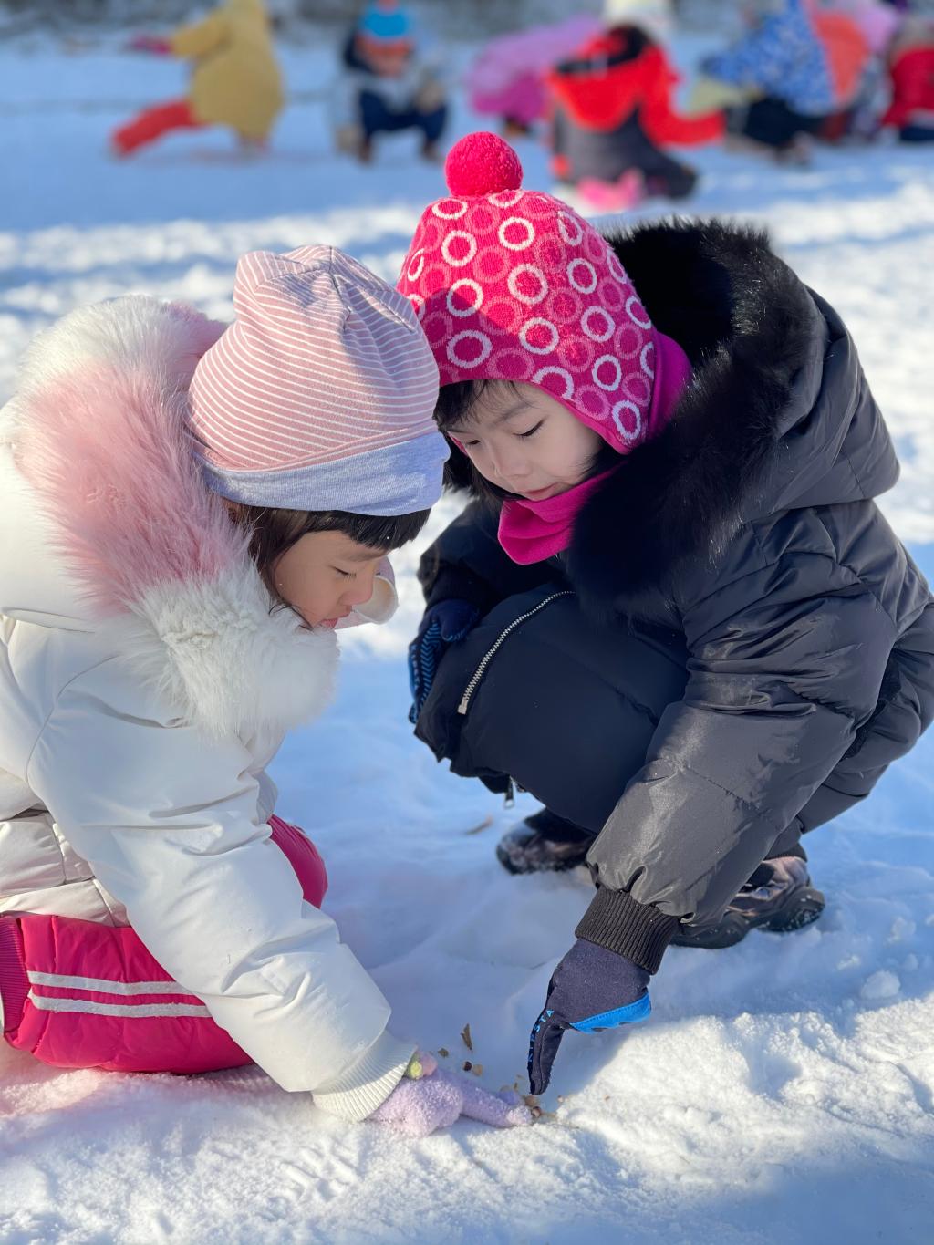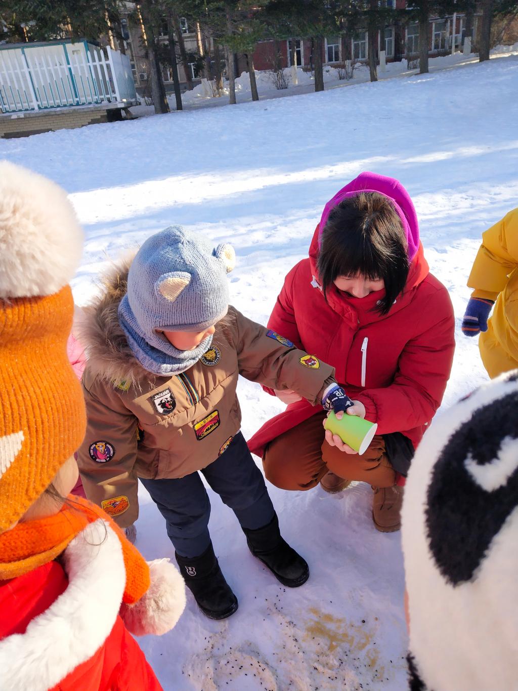 把它们投放到幼儿园的迷宫中、小菜园里、师大草坪上、灌木丛中,孩子们在雪地里踩出一个个小坑,细心的把食物倒在坑里。
