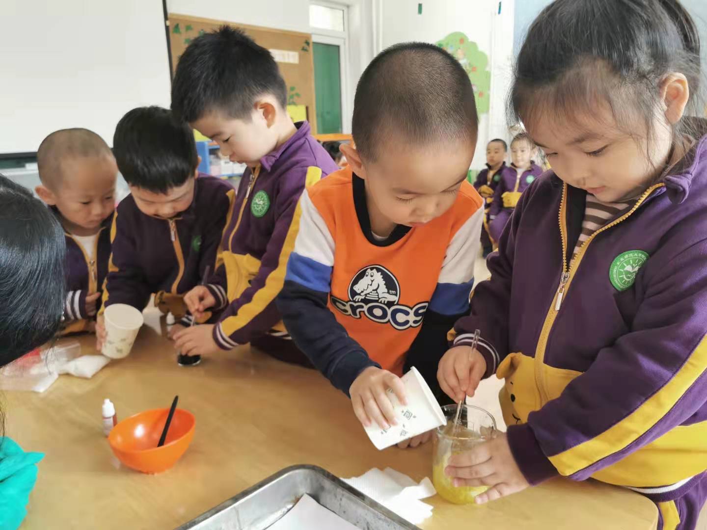 孩子们都举起小手跃跃欲试这个神奇的魔法,于是老师们将孩子们分成小组进行这个小实验,孩子们分工合作,有的幼儿倒聚丙烯酸钠粉末,有的幼儿倒水,有的幼儿负责搅拌、有的幼儿负责滴入色素,共同制作出了漂亮的彩色的冰雪……