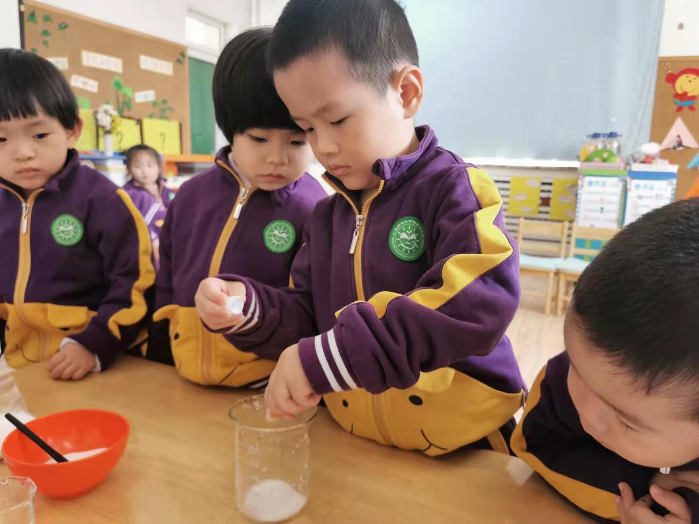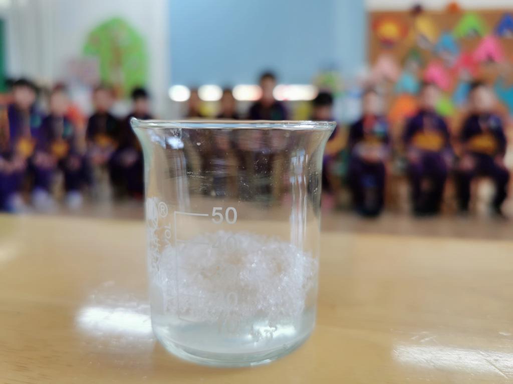 而他们为苗苗六班小朋友带来的化学小实验是点水成冰。