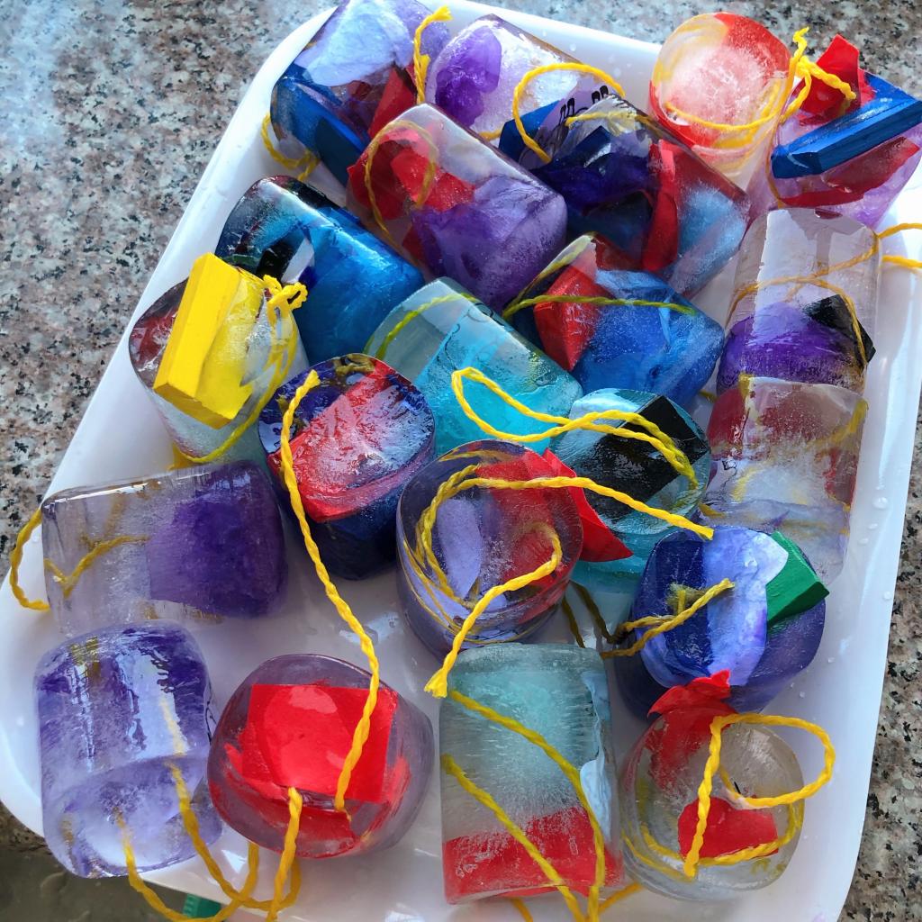 OK!完成啦!好期待冰花冻成的样子!孩子们将自己的冰花放到户外的窗台上。