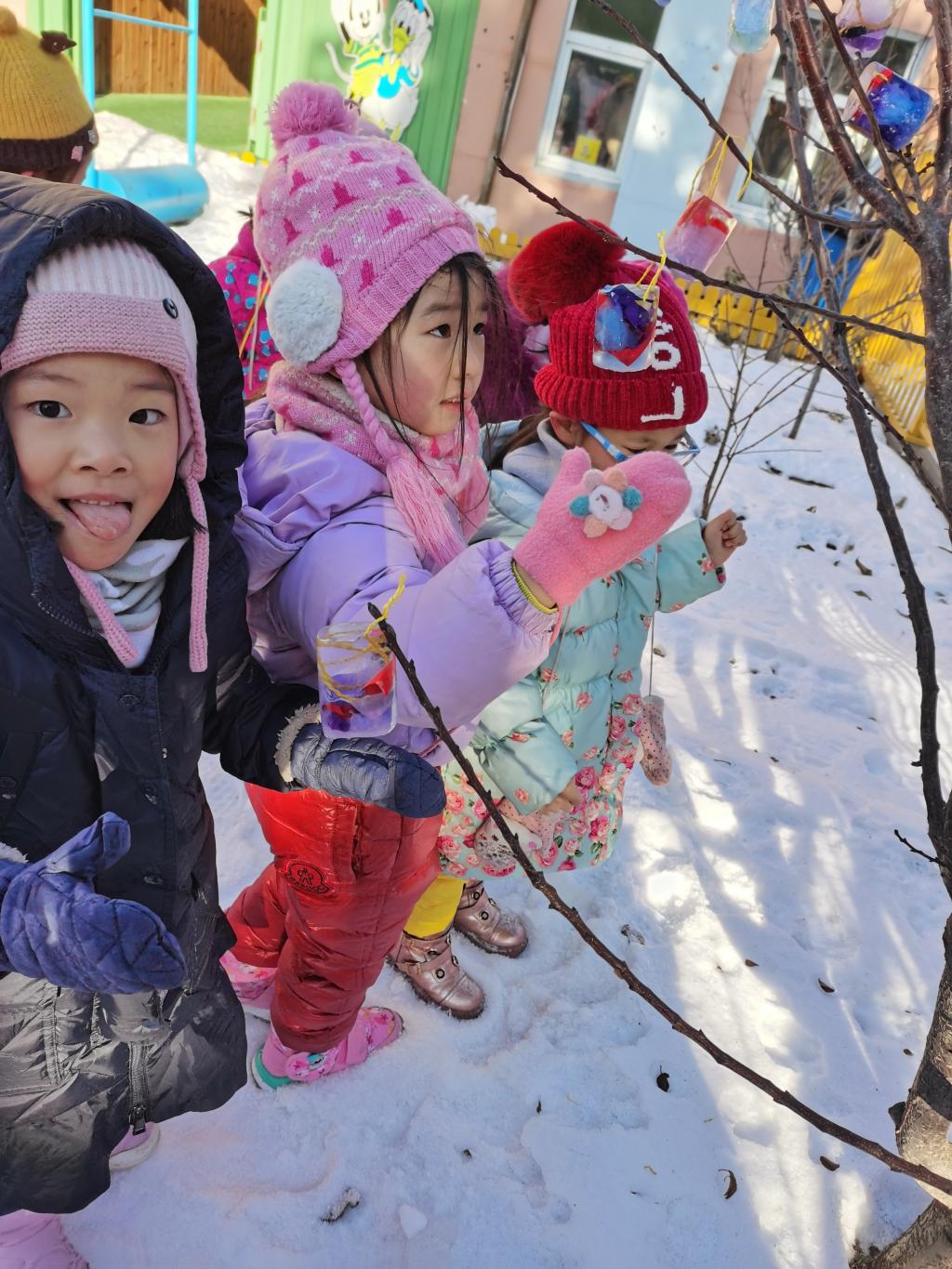 孩子们利用户外自由活动时间,将自己的冰花挂在幼儿园的树上,互相欣赏着冰花,互相评论、互相交流着。孩子的眼中充满了喜悦与欣喜。