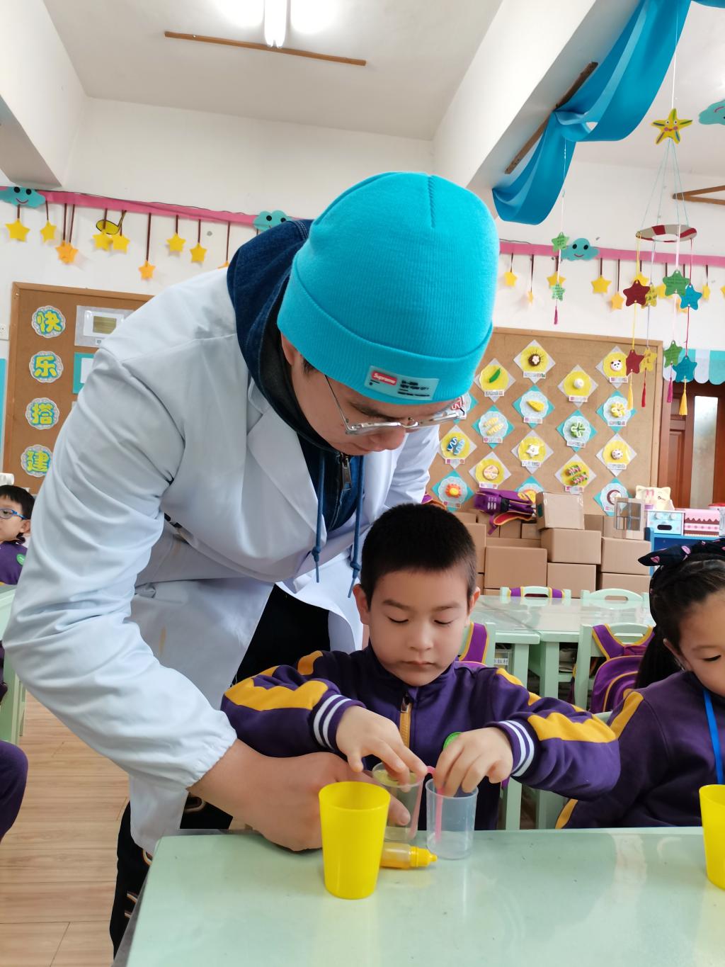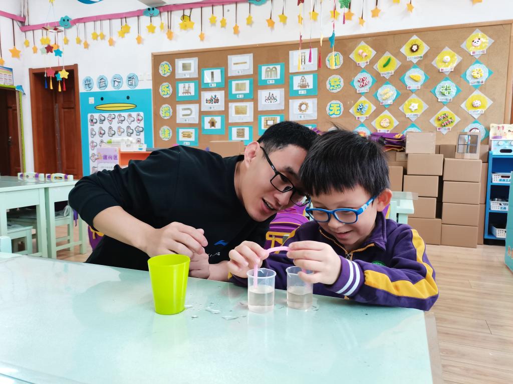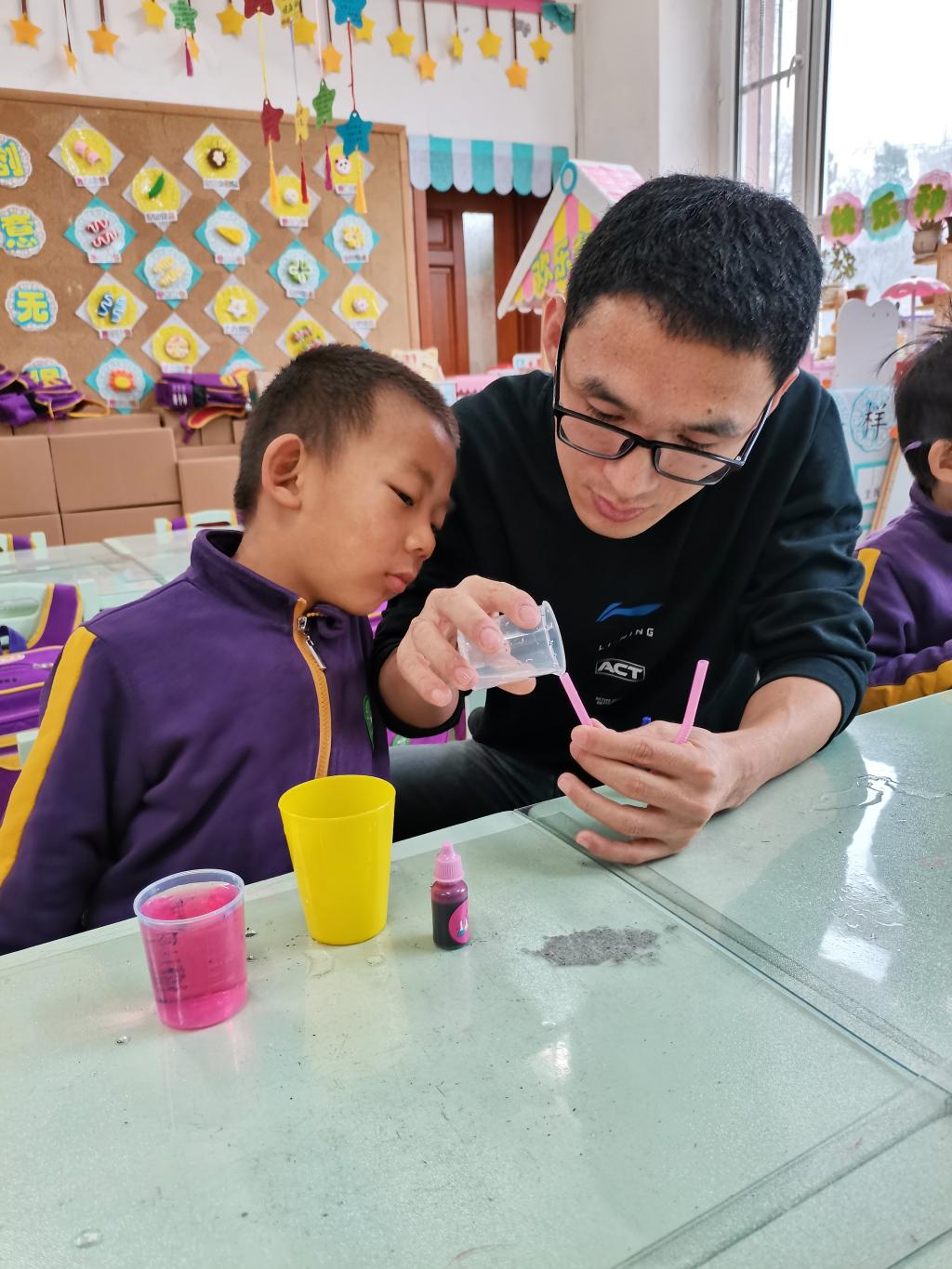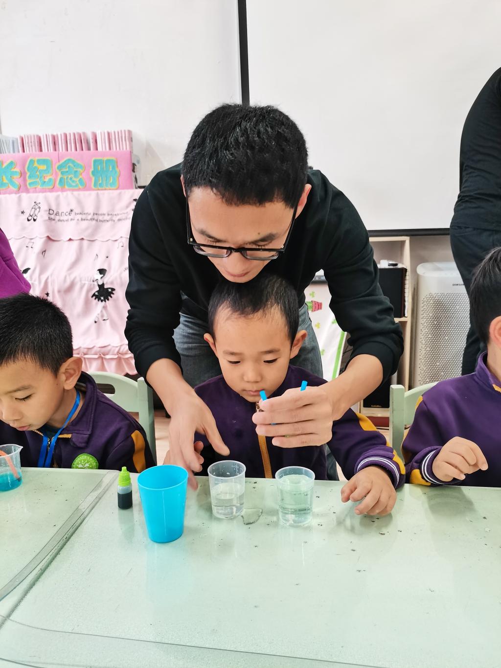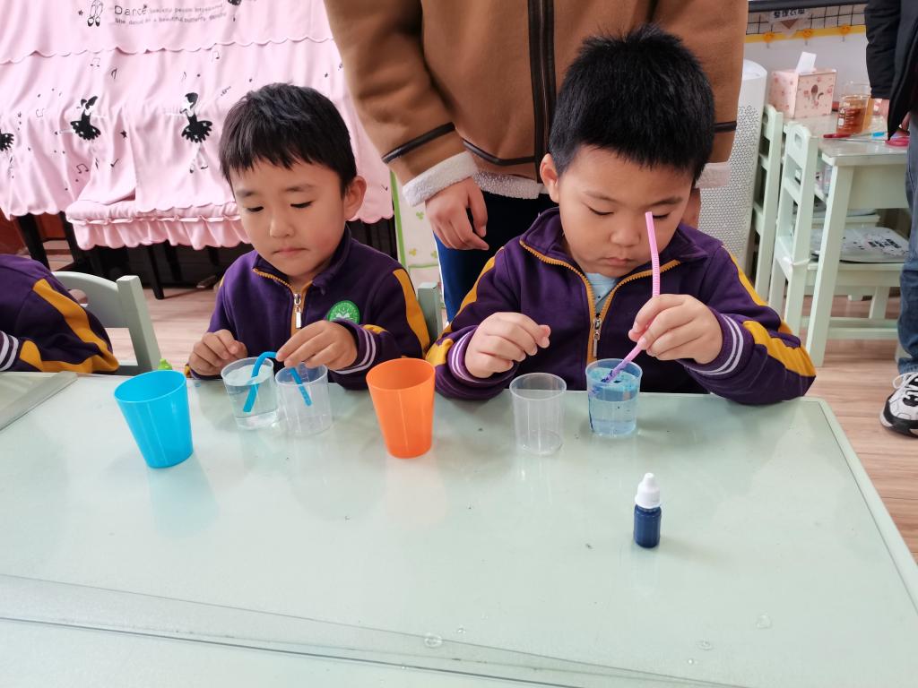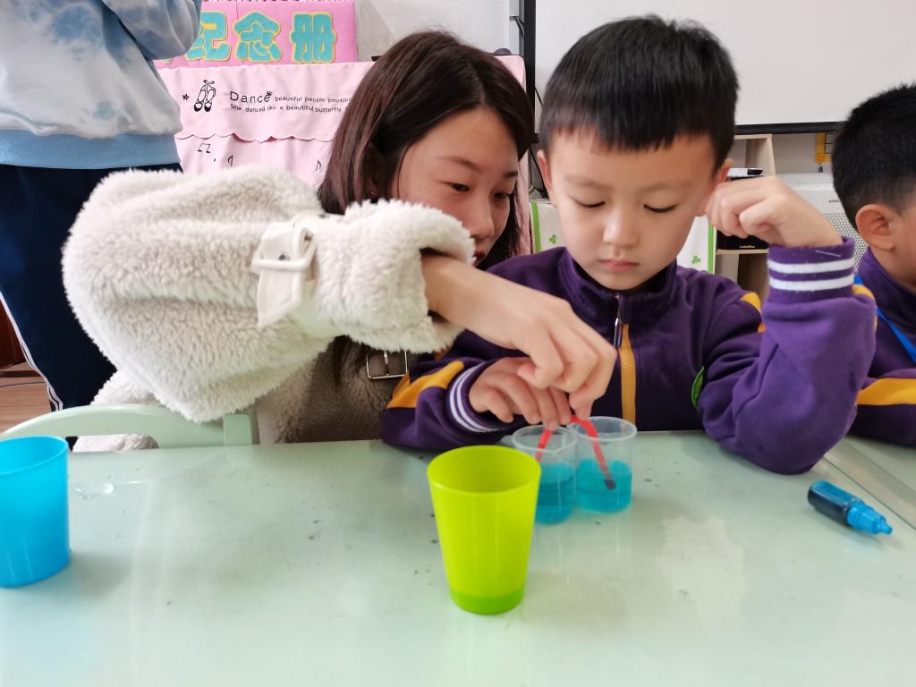 在理解实验原理之后,铭苏爸爸又亲自和每个小朋友进行了实验操作,并进行了耐心的讲解和帮助,直至孩子们操作成功,体验到了成功的快乐。