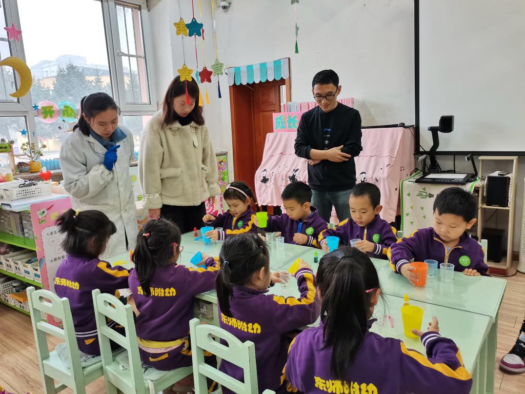 我园一直以来以“有兴趣、能专注、喜探究、愿合作”的学风培养孩子良好的学习品质,抓住每一个教育契机为孩子们提供学习、探索、操作的平台。我们特别邀请了王铭苏小朋友的爸爸,东北师范大学化学学院的王自坤老师和他的学生们来到班级和小朋友们一起探索科学的奥秘。