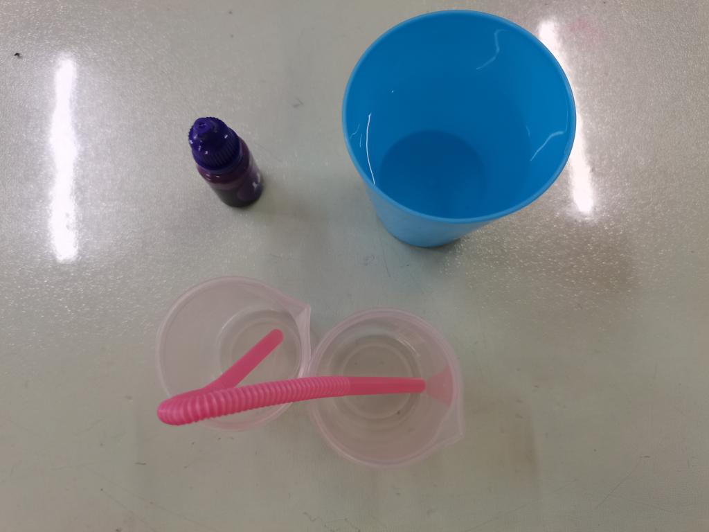 虹吸现象是大气压的应用,液体从液面较高的容器通过胶管越过高处而流入液面较低容器的现象。它发生的条件是胶管(虹吸管)里先要灌满液体,同时于较高液面的液柱压强不超过大气压。按照实验原理我们准备了吸管、量杯、色素、水、塑料杯等。